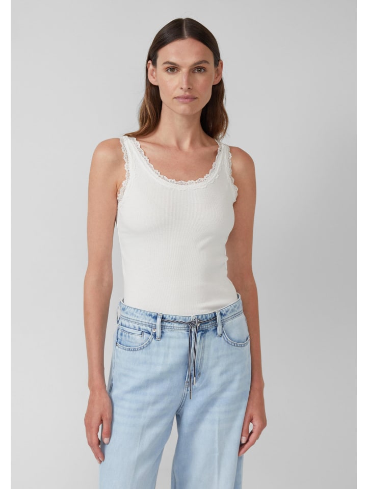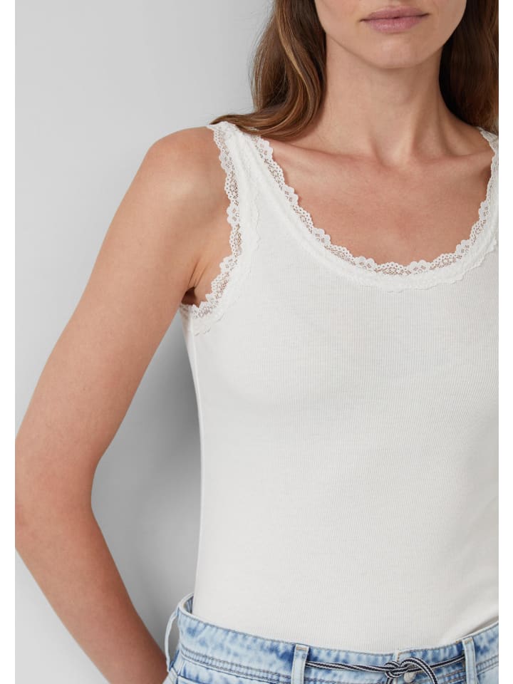 Мягкая майка из трикотажа с женственной кружевной отделкой на круглом вырезе. Эластичная ткань в рубчик и широкие бретели обеспечивают комфортную повседневную носку. Облегающий крой подчеркивает фигуру.