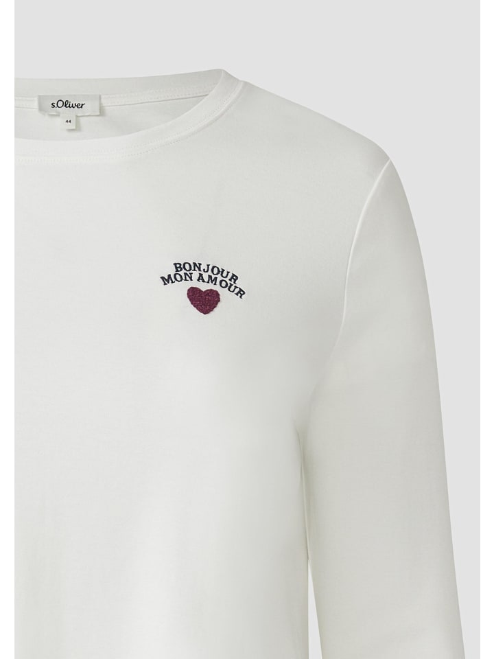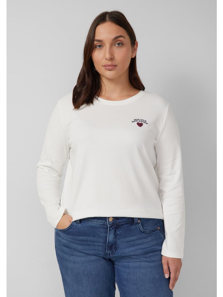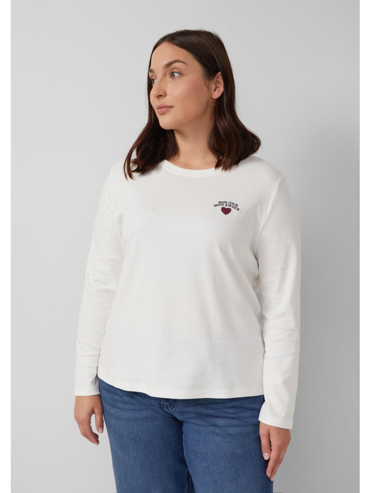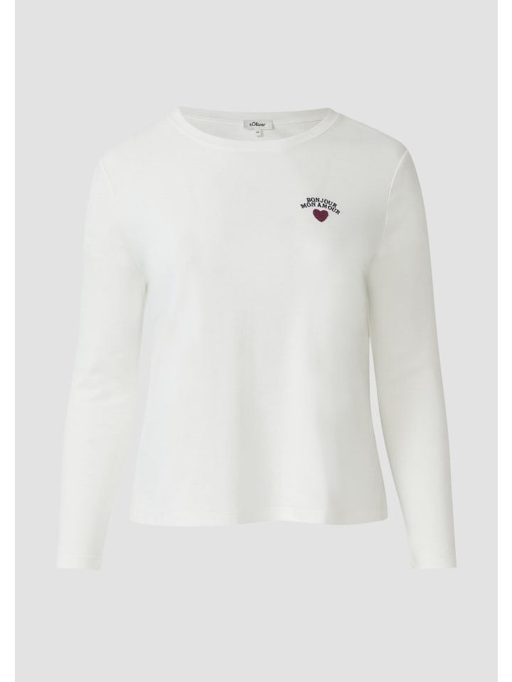 Этот мягкий топ прямого кроя с длинными рукавами украшен очаровательной вышивкой. Классический круглый вырез горловины с ребристой отделкой и высококачественный трикотаж интерлок делают его вашим незаменимым повседневным спутником на каждый день.