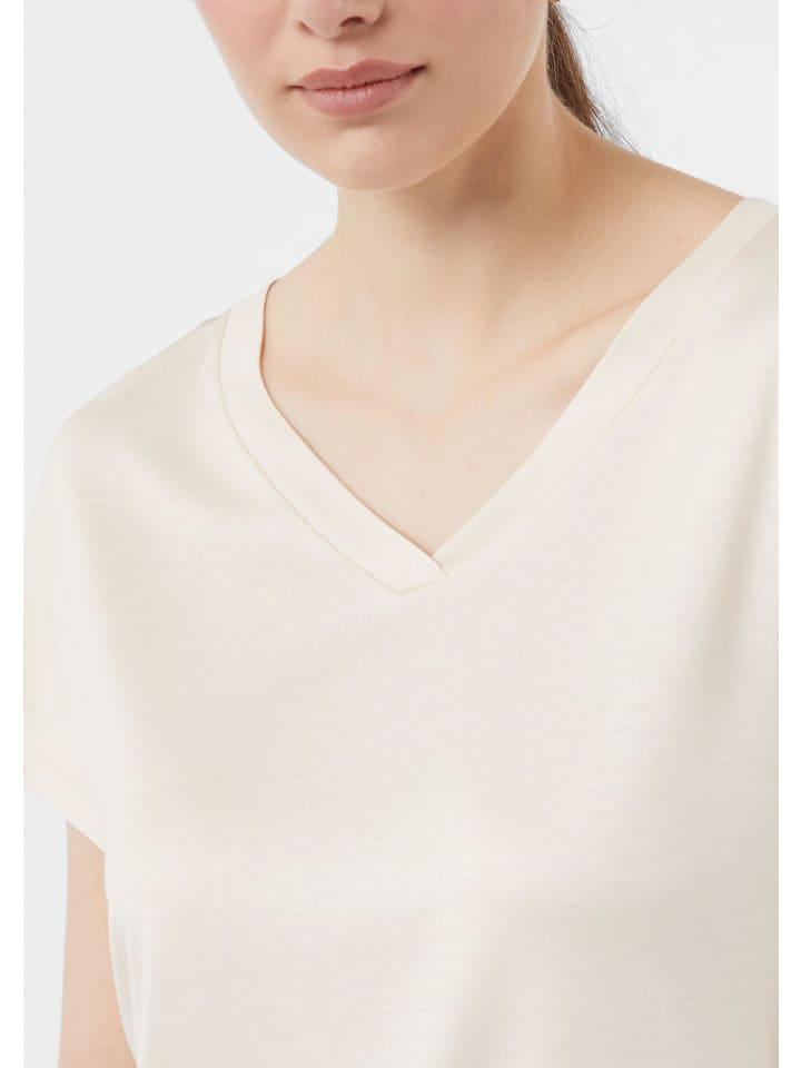 Сияющая роскошь для повседневной жизни: эта футболка с V-образным вырезом из струящейся вискозы сочетает в себе элегантность и комфорт. Прямой крой подчеркивает фигуру, а трикотаж приятен на ощупь. Эта модель идеально подходит для повседневных случаев и легко сочетается как с дневным, так и с вечерним гардеробом. Незаменимая вещь для модниц, которые ценят качество и стиль.