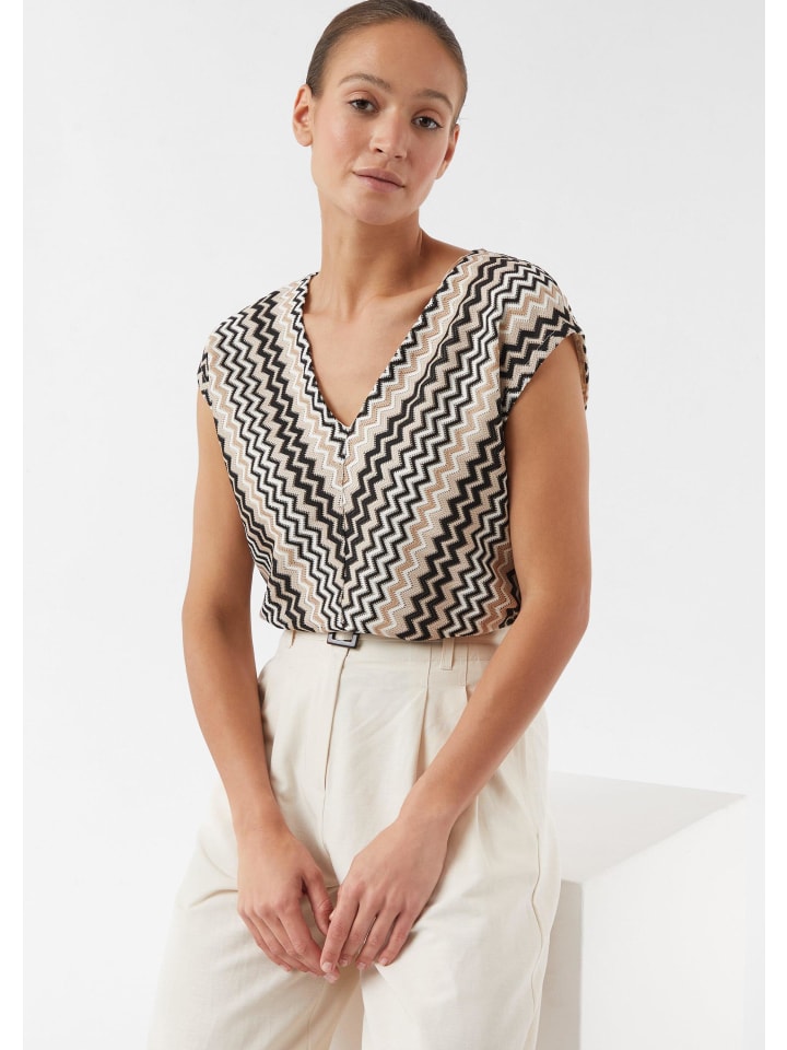 Стильный зигзаг: эта трикотажная рубашка с V-образным вырезом станет вашим новым фаворитом в повседневной жизни. Прямой крой и спущенная линия плеч создают свободный силуэт, а эффектный узор добавит модный штрих вашему образу. Идеально подходит для отпуска или спокойной городской жизни - сочетайте с джинсами или шортами для создания универсального образа.