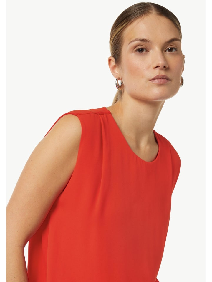 Изящный вискозный топ для деловых образов: эта футболка без рукавов прямого кроя впечатляет сочетанием материалов и элегантными складками. Круглый вырез горловины и застежка на петлю и пуговицу придают топу женственность. Трикотажная подкладка обеспечивает комфорт. Сочетайте ее различными способами с блейзером и юбкой-карандаш для создания делового образа.
