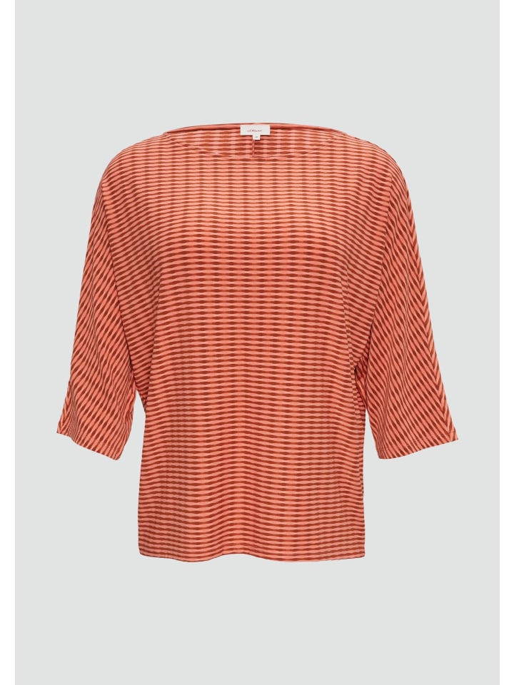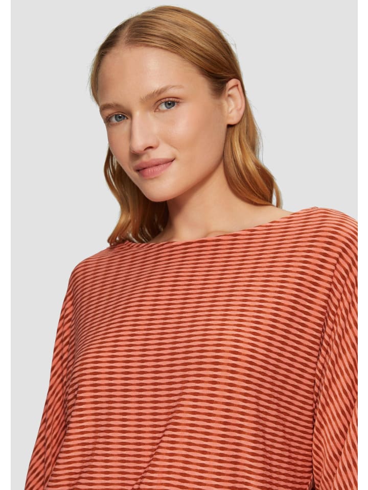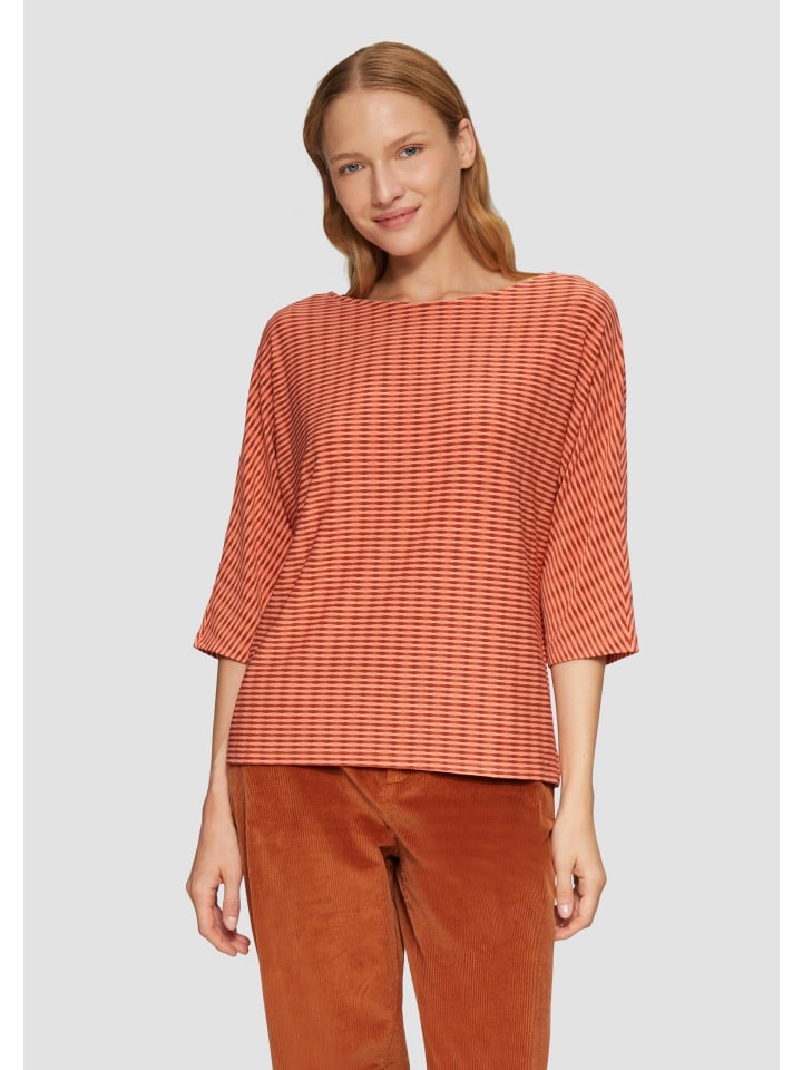 Элегантная рубашка в полоску из эластичного трикотажа с рукавами «летучая мышь» 3/4 и женственным вырезом «лодочка». Текстурированная поверхность придает рубашке особый шарм и делает ее подходящей для непринужденного повседневного ношения.