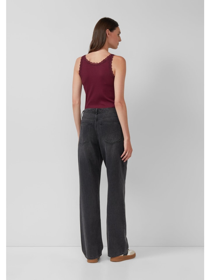 Мягкая майка из трикотажа с женственной кружевной отделкой на круглом вырезе. Эластичная ткань в рубчик и широкие бретели обеспечивают комфортную повседневную носку. Облегающий крой подчеркивает фигуру.
