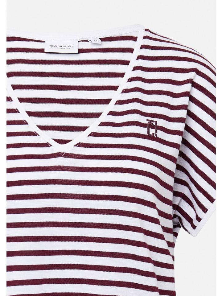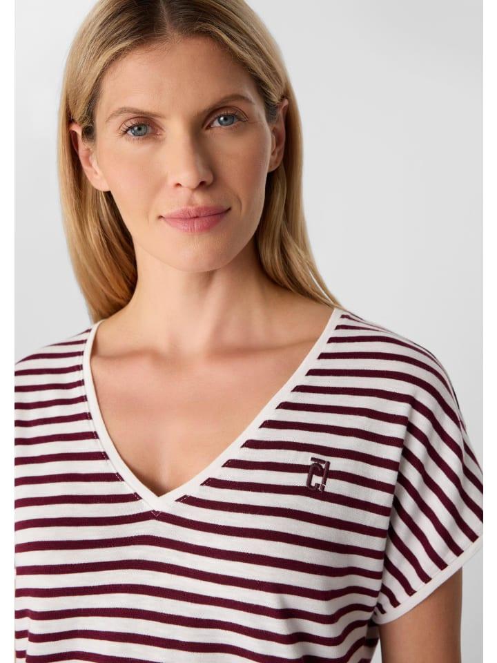 Полоски и комфорт: этот трикотажный топ с V-образным вырезом - ваш новый фаворит в повседневной жизни. Классический крой и спущенная линия плеч создают непринужденный силуэт, а трикотажные полоски добавляют нотку морского стиля. Вышитый логотип добавляет тонкий акцент. Сочетайте его с джинсами для создания непринужденного повседневного образа или с блейзером для создания элегантного делового повседневного образа.