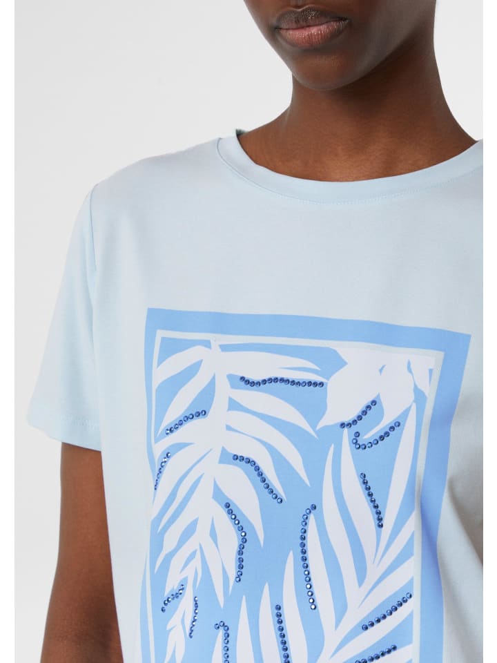Сияйте стильно: эта футболка из хлопковой смеси сочетает в себе комфорт и элегантность. Классический круглый вырез горловины и короткие рукава создают классический силуэт, а сверкающие стразы добавляют нотку гламура в повседневный образ. Идеально подходит для отпуска или спокойной городской жизни.