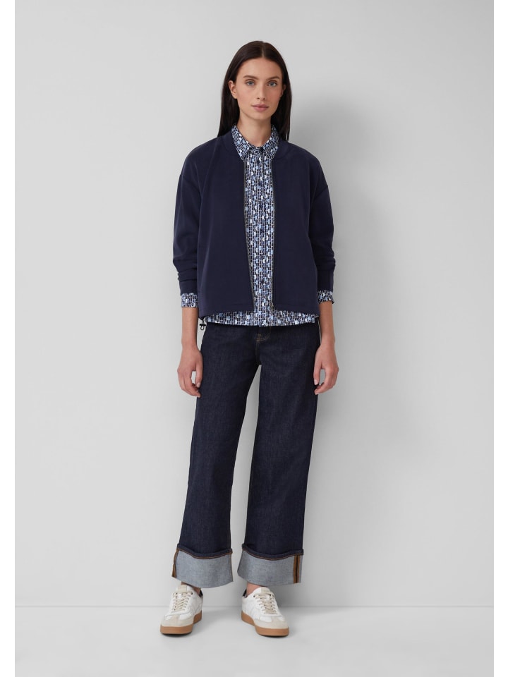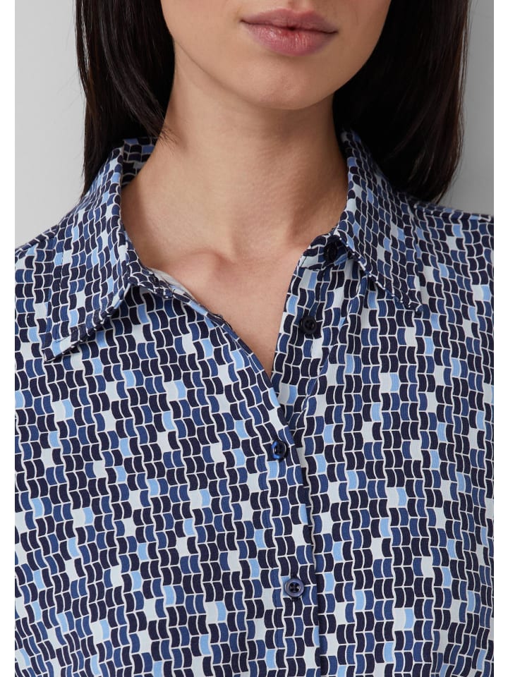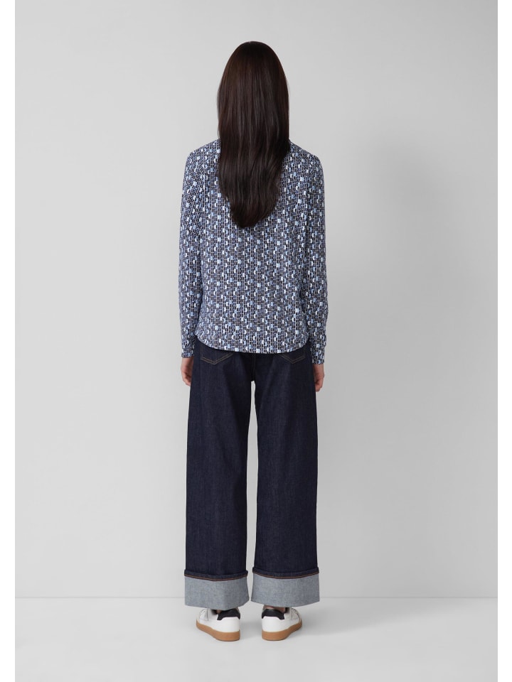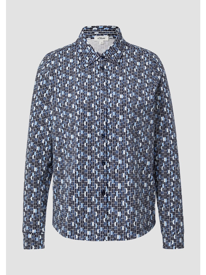 Эта блузка-рубашка из эластичного трикотажа свободного кроя обеспечивает исключительный комфорт и мягкость. Узор по всей поверхности и закругленный низ придают особый шарм этому повседневному образу. Отложной воротник и практичная планка на пуговицах.