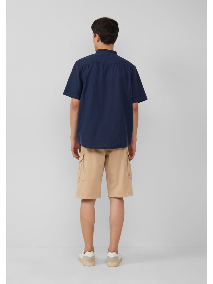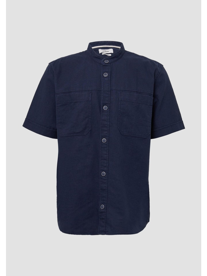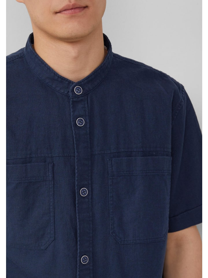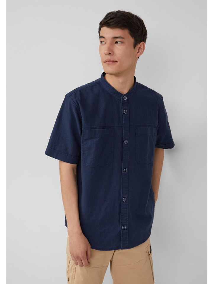 Повседневная рубашка с короткими рукавами из дышащей креп-льняной ткани свободного кроя. Современный воротник-стойка и накладной нагрудный карман добавляют спортивный штрих к однотонному повседневному стилю. Удобная планка на пуговицах и закругленный подол.