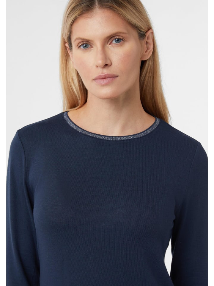 Сияйте стилем: эта рубашка с длинными рукавами из гладкого трикотажа сочетает в себе комфорт и элегантность. Классический круглый вырез горловины и облегающий крой создают привлекательный силуэт. Изящные блестки добавят немного гламура вашему образу. Идеально подходит для повседневной носки и торжественных случаев - вы сами решаете, как ее носить.