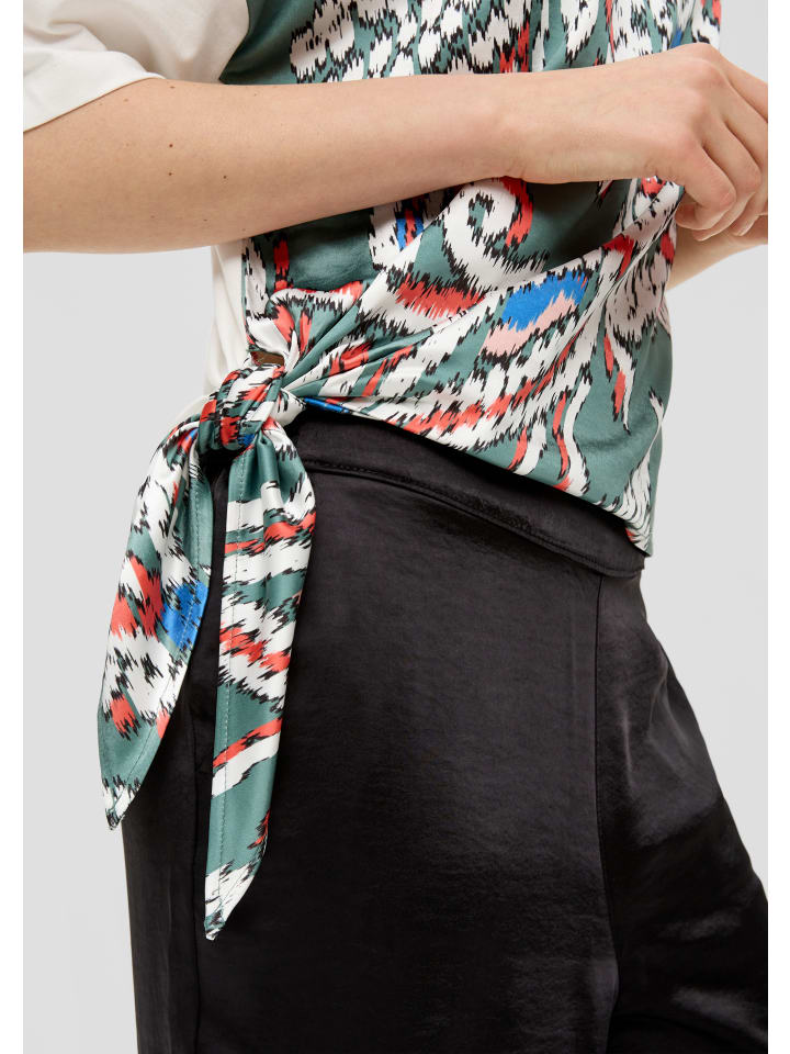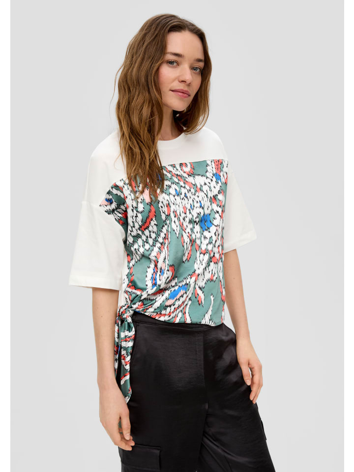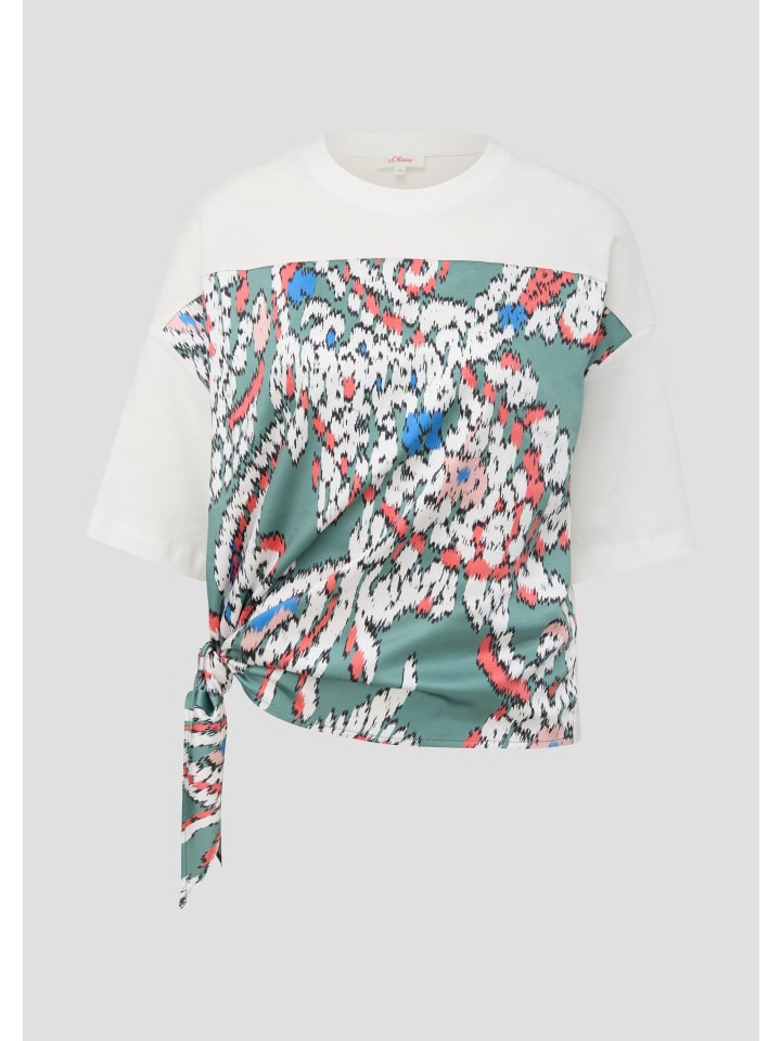 Эта повседневная футболка из джерси с модным принтом спереди и свободным кроем становится еще привлекательнее благодаря продуманному узлу. Эластичная ткань и спущенные плечи обеспечивают максимальный комфорт для повседневной носки.