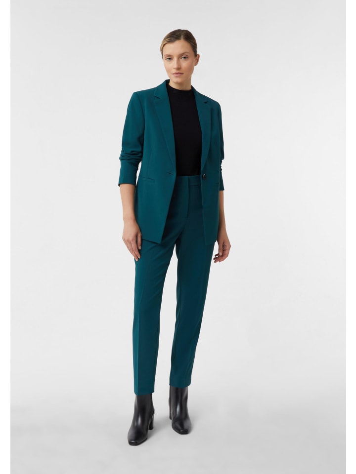 Элегантность в сочетании с вневременной изысканностью: эти брюки-сигареты с заглаженными стрелками впечатляют своим женственным облегающим силуэтом и высококачественным креповым материалом. Струящийся материал подчеркивает фигуру, а длина до щиколотки добавляет современный и непринужденный вид. Формованный пояс с застежкой на крючок, глазок и молнию гарантирует идеальную посадку. Практичные боковые карманы дополняют дизайн. Эти универсальные брюки можно легко надеть как на каждый день, так и на праздник. (С блузкой и туфлями-лодочками)