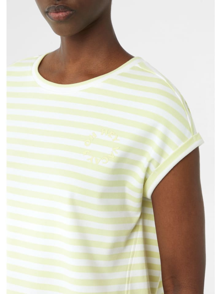 Полосатая футболка с очаровательным силуэтом: эта рубашка прямого кроя сочетает в себе непринужденную элегантность и летнюю легкость. Круглый вырез горловины и спущенные плечи создают непринужденный силуэт. Трикотажные полосы и изысканная вышивка добавляют модные акценты. Смещенный боковой шов обеспечивает оптимальную посадку. Комбинируйте различными способами для создания стильного повседневного образа.