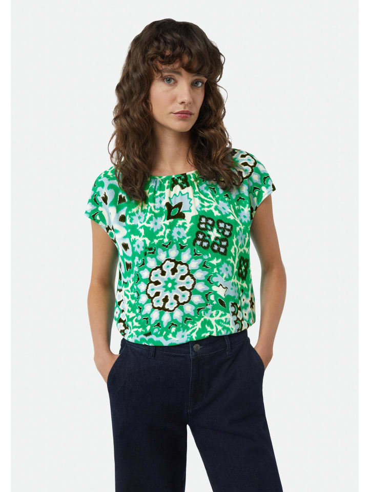 Летняя изысканность: эта блузка из смеси тканей сочетает в себе комфорт и стиль. Абстрактный принт по всей поверхности на трикотаже и ткани добавит художественный штрих вашему образу. Благодаря круглому вырезу и свободному крою она подчеркнет любую фигуру. Идеально подходит для повседневных случаев и отдыха - сочетайте ее с легкими брюками для создания непринужденного, но стильного образа.