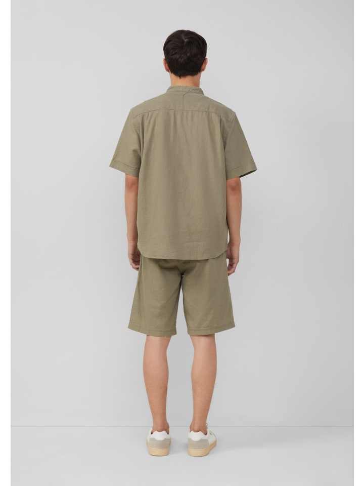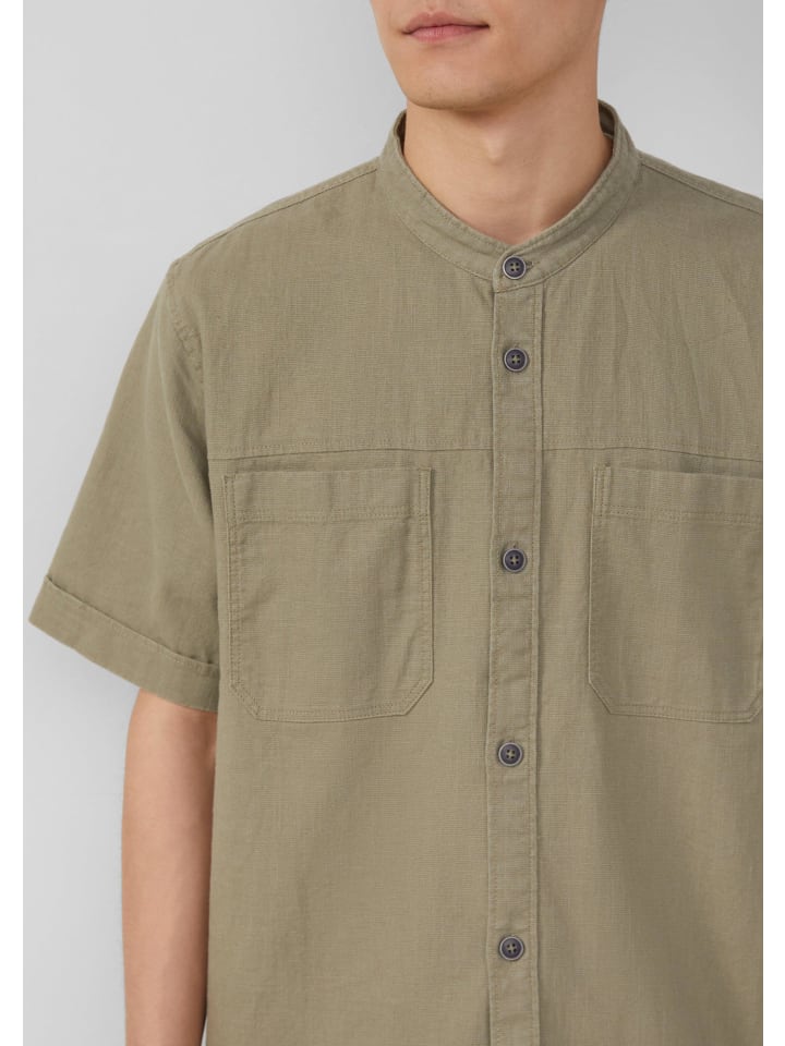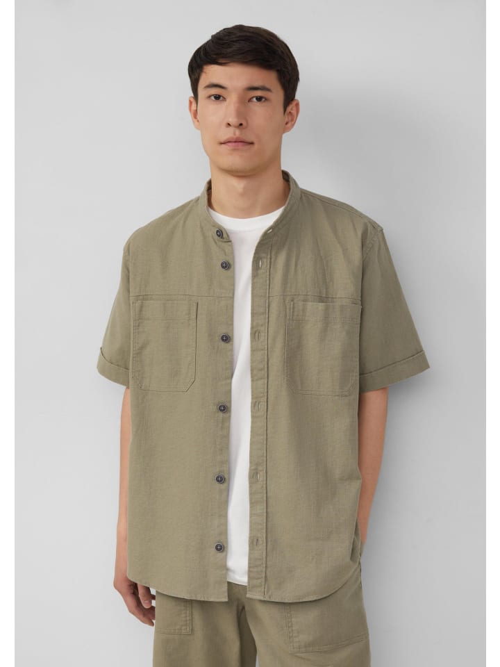 Повседневная рубашка с короткими рукавами из дышащей креп-льняной ткани свободного кроя. Современный воротник-стойка и накладной нагрудный карман добавляют спортивный штрих к однотонному повседневному стилю. Удобная планка на пуговицах и закругленный подол.