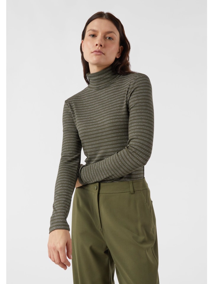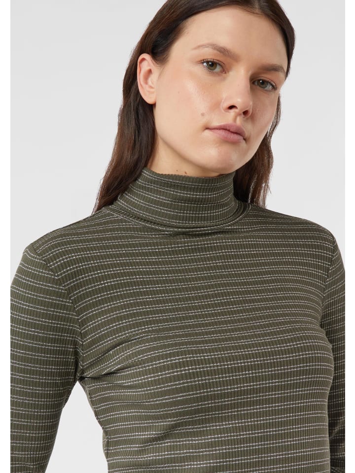 Гламурная и удобная: эта женственная водолазка сочетает в себе элегантную блестящую пряжу и комфортную ребристую вязку. Высокий вырез и длинные рукава создают привлекательный силуэт. Универсальная базовая вещь, идеально подходящая для повседневных образов, обеспечивает исключительный комфорт благодаря высокому качеству изготовления.