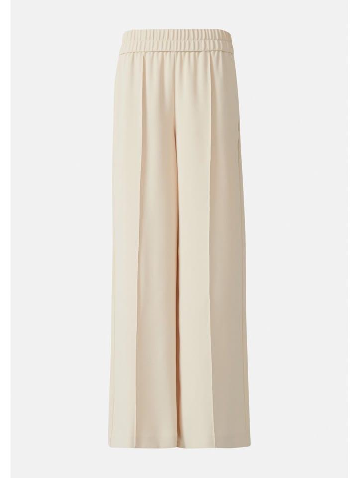 Струящаяся элегантность и комфорт: эти брюки широкого кроя из креп-полиэстера сочетают в себе современный дизайн и комфорт. Эластичный пояс средней посадки подчеркивает фигуру, а складки добавляют изысканности. Благодаря боковым карманам и стандартной длине брюки достаточно универсальны, чтобы сочетаться с любым деловым или повседневным нарядом. Сочетайте брюки с шелковым топом для создания элегантного образа или с укороченным топом для создания модного образа.