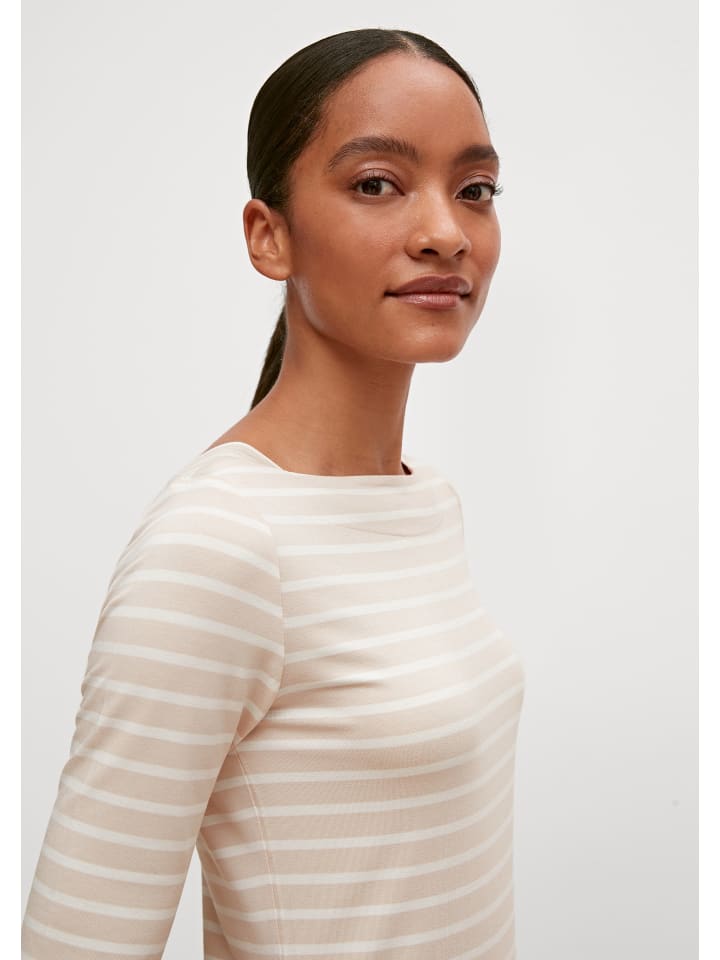 Удобная и женственная: эта футболка из струящейся смеси вискозы и эластана выгодно подчеркивает фигуру благодаря своему приталенному крою. Квадратный вырез горловины и рукава до середины голени придают этой полосатой рубашке непринужденный, но стильный вид на каждый день. Пусть эта вещь вдохновит вас на создание собственного стиля casual-шика.