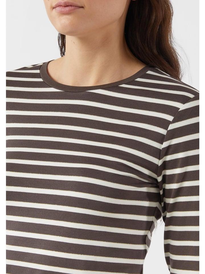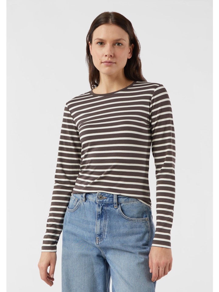 Этот полосатый топ с длинными рукавами из мягкого трикотажного трикотажа впечатляет своим классическим полосатым узором и изящными блестящими деталями. Классический круглый вырез горловины и облегающий крой элегантно подчеркнут ваш силуэт. Идеально подходит для повседневных образов - сочетайте его с джинсами и кроссовками или надевайте с блейзером и туфлями-лодочками на вечер. Длинные рукава делают эту универсальную базовую модель идеальным выбором для прохладных дней и обеспечат стильный образ для любого случая.