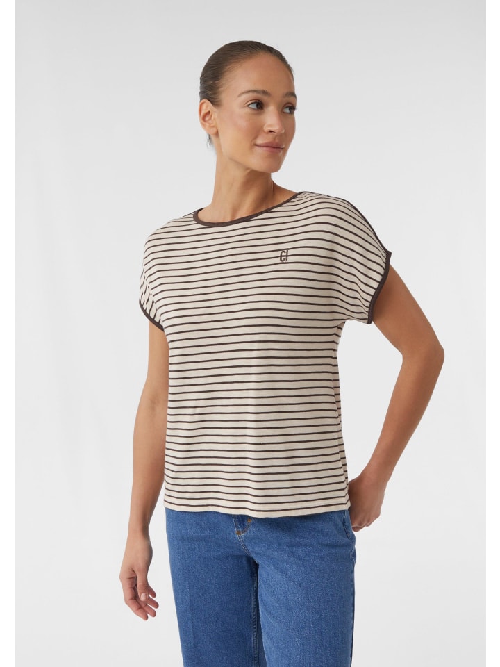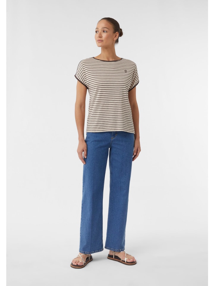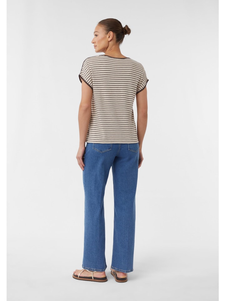 Полосатый шик и комфорт: эта трикотажная футболка со спущенными плечами сочетает в себе повседневный стиль и комфорт. Классический круглый вырез горловины и классический крой подчеркивают фигуру, а эффектный принт спереди добавляет модный штрих. Эта универсальная модель идеально подходит для повседневных случаев и легко сочетается с джинсами или юбками.