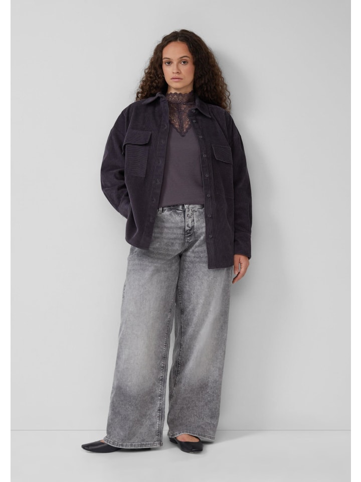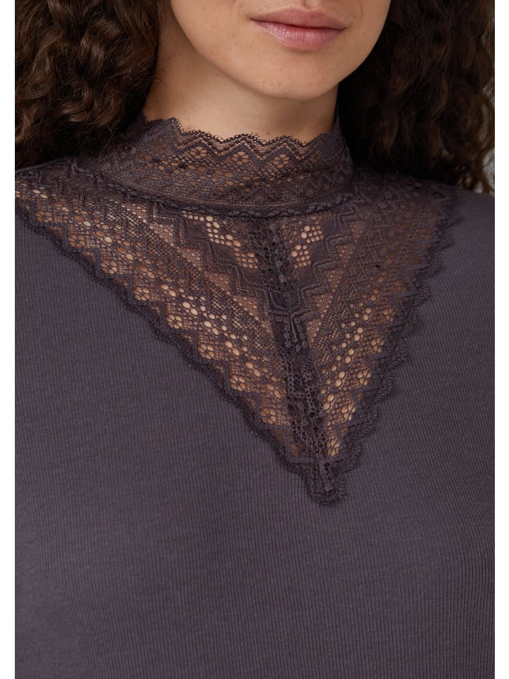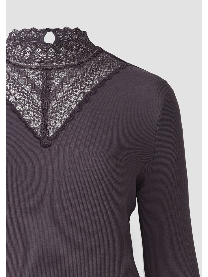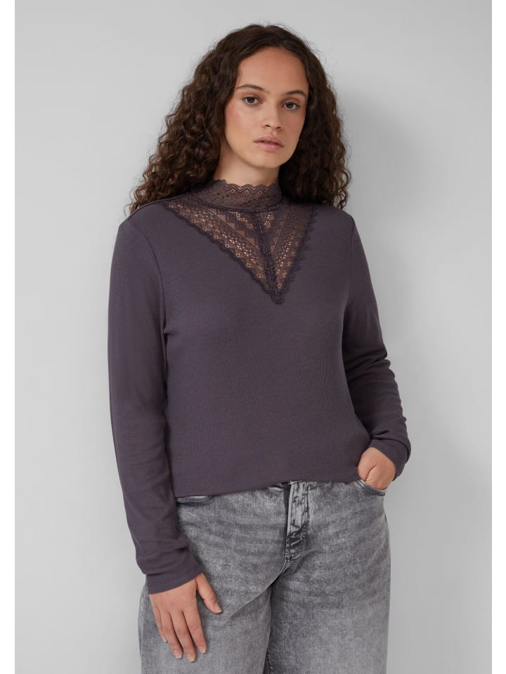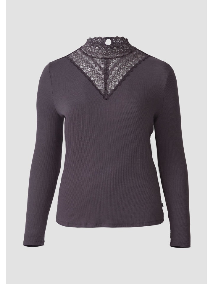 Кружево и ребристая ткань: эта женственная рубашка с длинными рукавами и воротником-стойкой обязательно станет вашим новым фаворитом. Мягкая, эластичная и облегающая, она идеально дополнит ваш образ жизни. Застежка на пуговицы с петлей добавит стильный штрих к вашему повседневному образу.