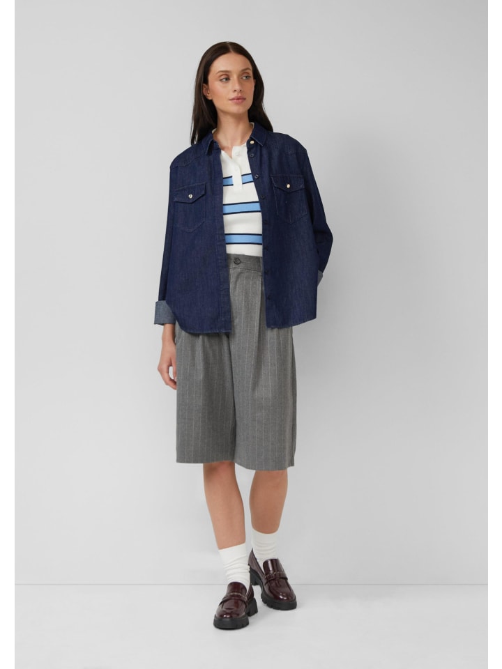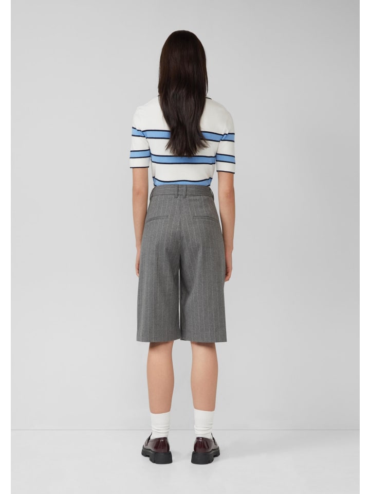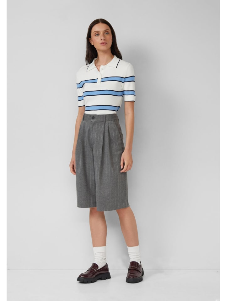 Стильные шорты-бермуды с очень широкими штанинами и высокой талией. Тонкие полоски добавляют элегантности, а складки и боковые карманы дополняют современный образ. Универсальный вариант как для расслабленных летних дней, так и для более нарядных случаев.