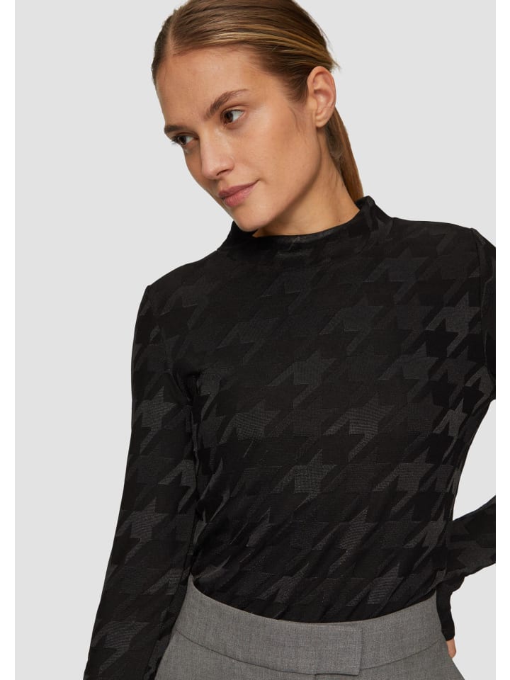 Стильная футболка с длинными рукавами и модным узором «гусиная лапка» - идеальный вариант для повседневного образа! Высокий вырез горловины с воротником-стойкой добавит элегантности. Благодаря облегающему крою и мягкому вискозному трикотажу футболка приятна к телу. Сочетайте ее с джинсами для создания непринужденного повседневного образа или с юбкой для создания элегантного офисного образа.