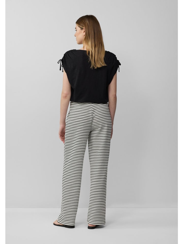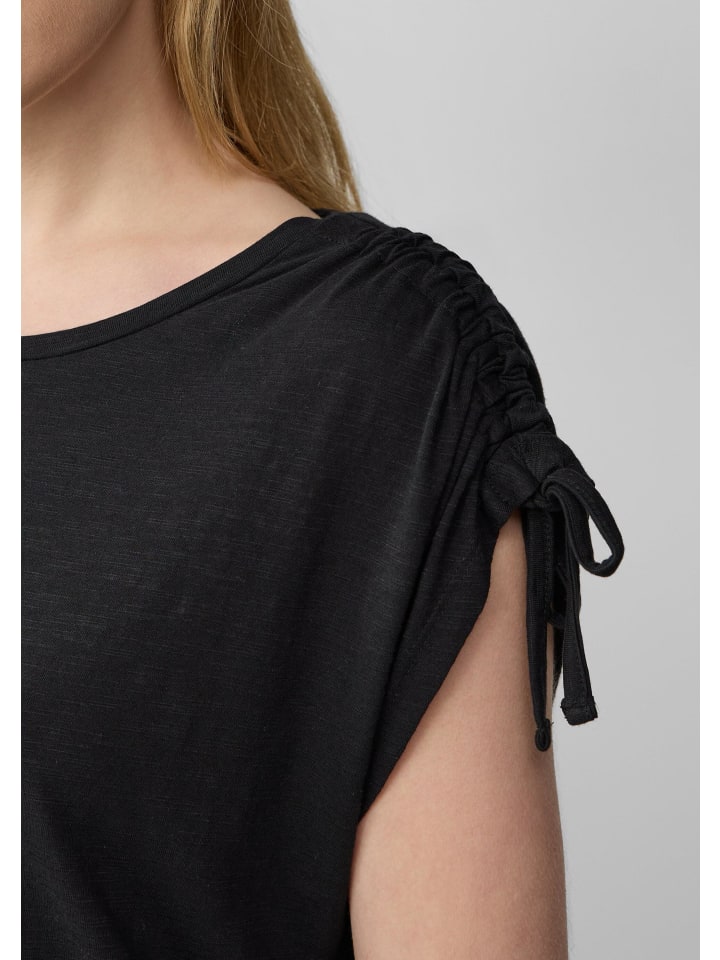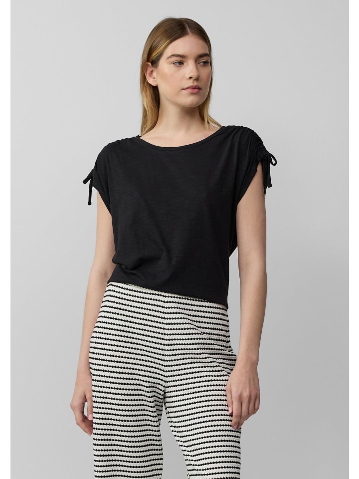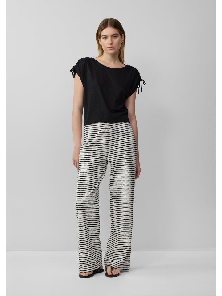 Свободная футболка из мягкого трикотажного полотна с фактурной пряжей, с непринужденной сборкой и спущенными плечами. Классический круглый вырез горловины и свободный крой сделают ее идеальным повседневным спутником для ваших непринужденных дней.