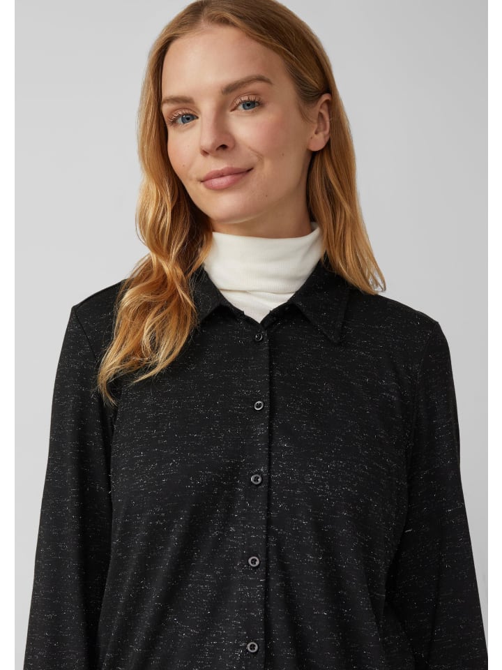 Элегантная трикотажная блузка с мерцающей блестящей пряжей для непринужденного, повседневного образа. Удлиненный задний подол и классический рубашечный воротник добавляют элегантности мягкому вискозному миксу. Застежка на пуговицы и свободный крой.