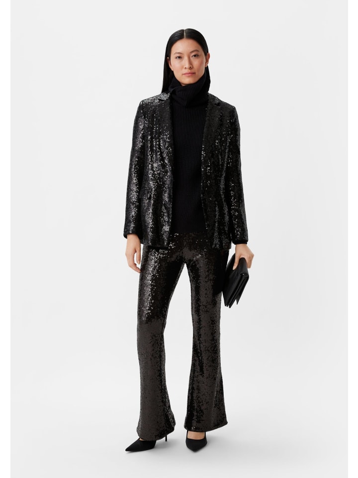 Гламур: В праздничный сезон мерцающие детали выходят на первый план. Изюминка эффектного наряда: эти брюки с пайетками. Их легкий клеш создает изящный силуэт. Элегантная блузка и черные туфли дополнят ваш современный и гламурный образ.
