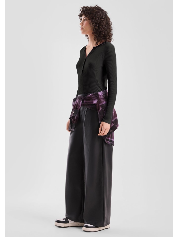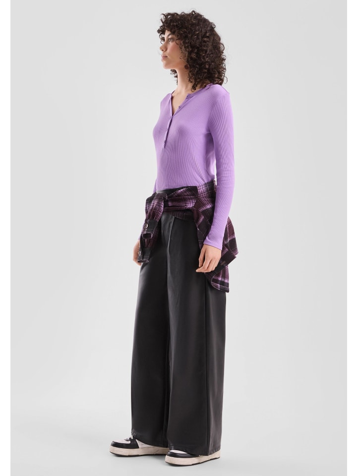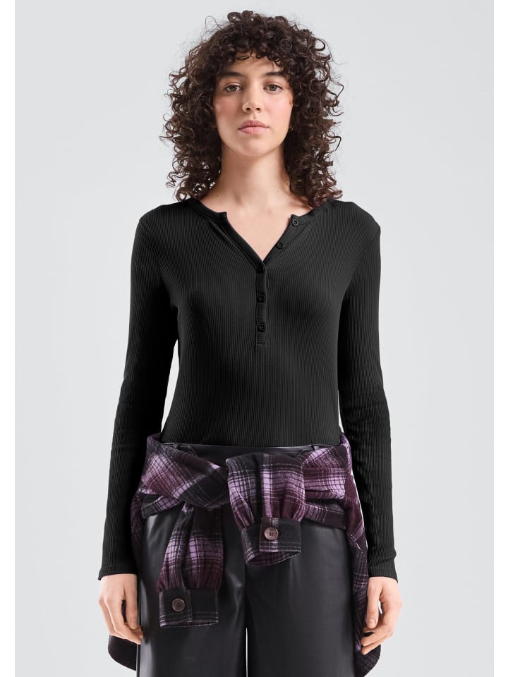 Этот топ с длинными рукавами в рубчик и планкой на пуговицах на горловине станет вашим новым фаворитом в гардеробе. Мягкая эластичная ткань в рубчик обеспечивает идеальный комфорт, а облегающий крой подчеркивает фигуру. Носите его с джинсами или стильно с юбкой - он готов к повседневной носке и спонтанным встречам.