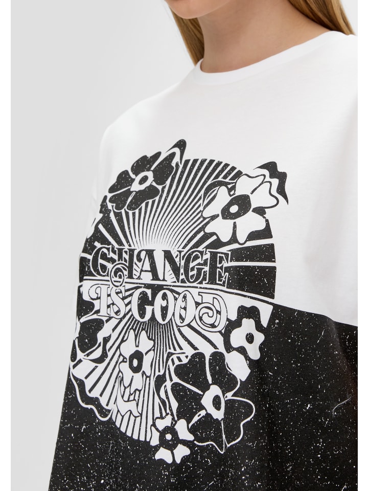Ваш новый любимый образ: короткая хлопковая футболка свободного кроя. Идеально подходит для стильных образов и расслабленного отдыха. Свободный крой с принтом спереди и круглым вырезом горловины идеально подходит для активного образа жизни. Высококачественный трикотаж обеспечивает максимальный комфорт.