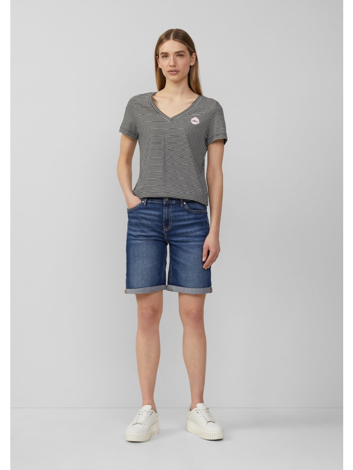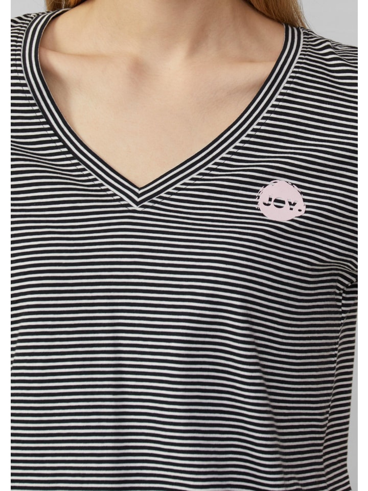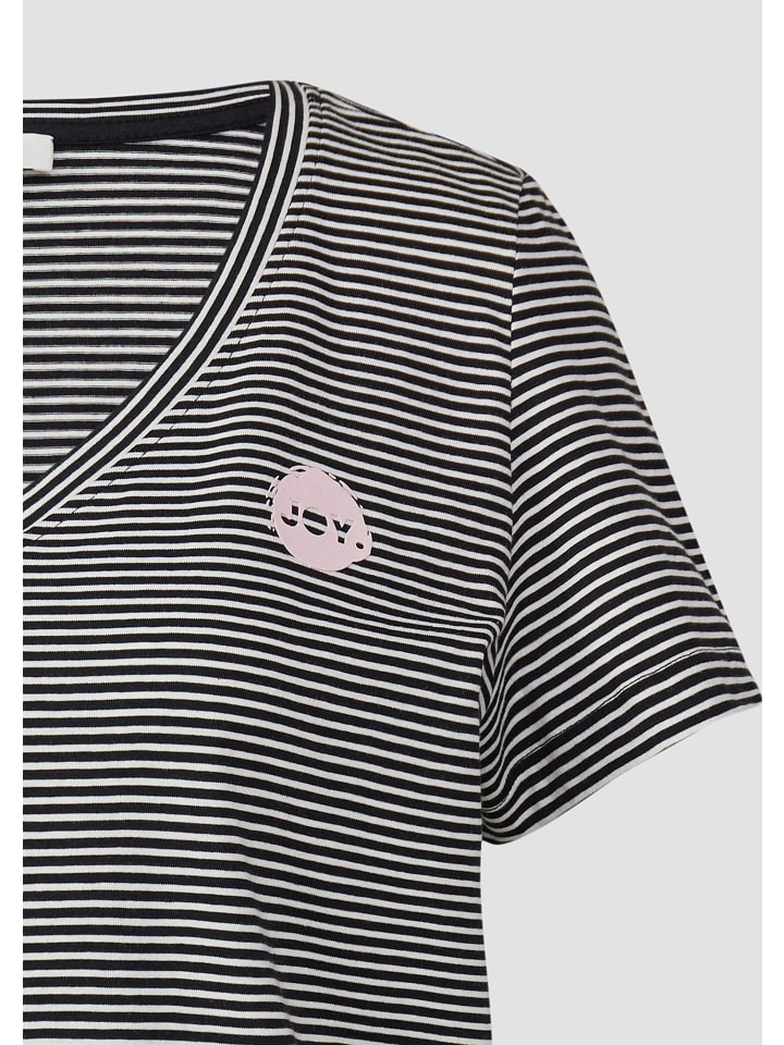 Полосатый комфорт для вас: эта мягкая трикотажная футболка с V-образным вырезом и принтом спереди станет вашим незаменимым спутником на каждый день. Идеально подходит для непринужденных встреч с друзьями или уютного вечера дома. Как насчет прогулки?