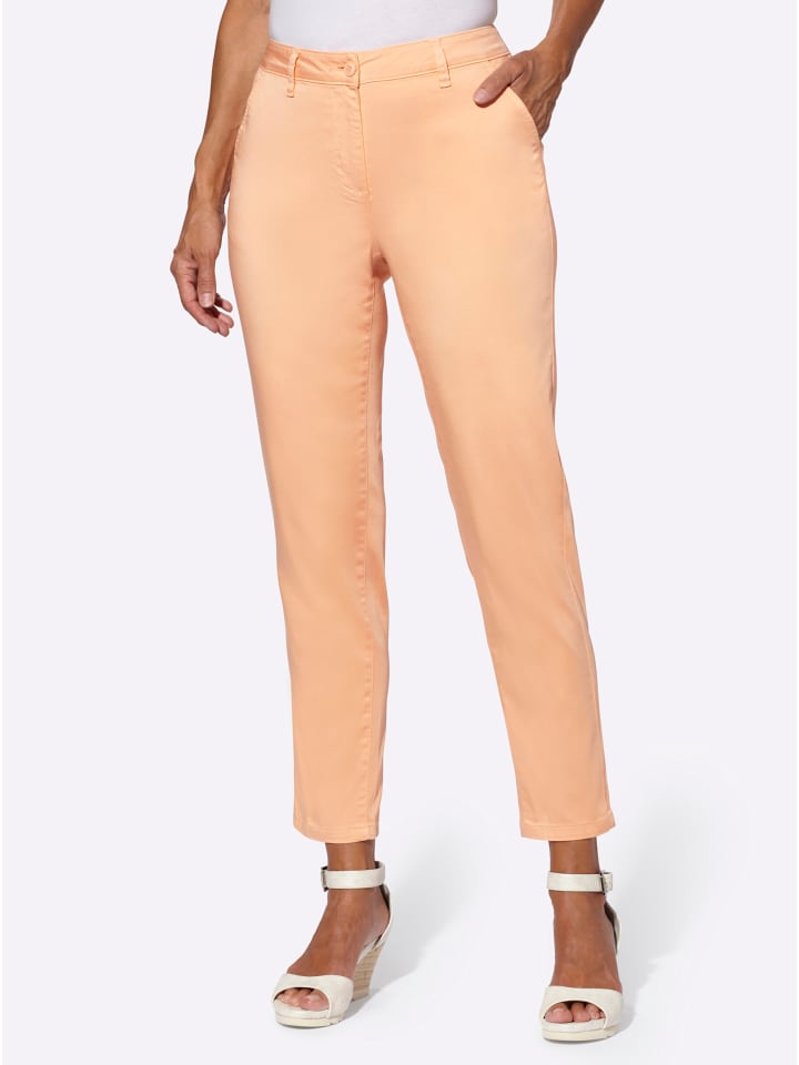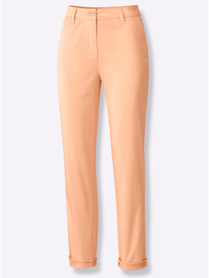 Эти брюки впечатляют своим чинос-стилем и легкой летней матовой тканью, как в расстегнутом виде, так и в закатанном. Они имеют фигурный пояс со шлевками для ремня, застежку на пуговицу и молнию спереди, два передних кармана и имитацию прорезных карманов сзади. Боковой шов, смещенный вперед, создает привлекательный силуэт. Соответствует инициативе «Хлопок, сделанный в Африке». Длина брючины около 34 см. Ремень не входит в комплект.