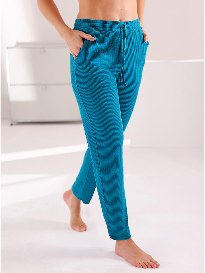 Прекрасно струящиеся длинные брюки из приятного на ощупь материала. С тонкой рубчатой текстурой и слегка начесанной лицевой поверхностью. Втачной пояс с кулиской и завязкой, 2 французских кармана. Одинарный трикотаж.