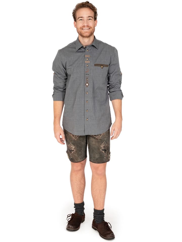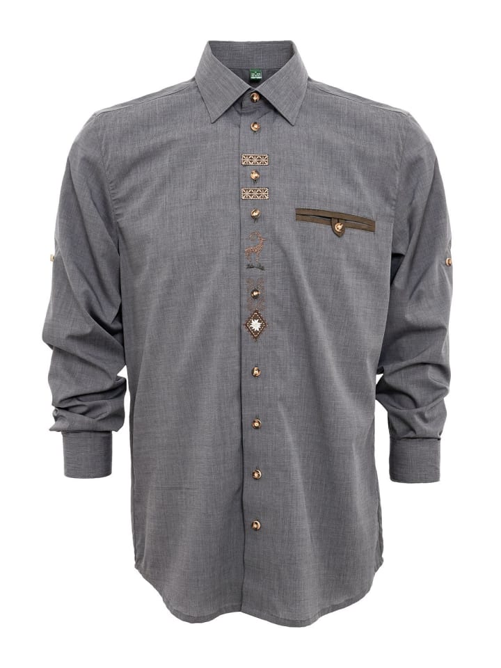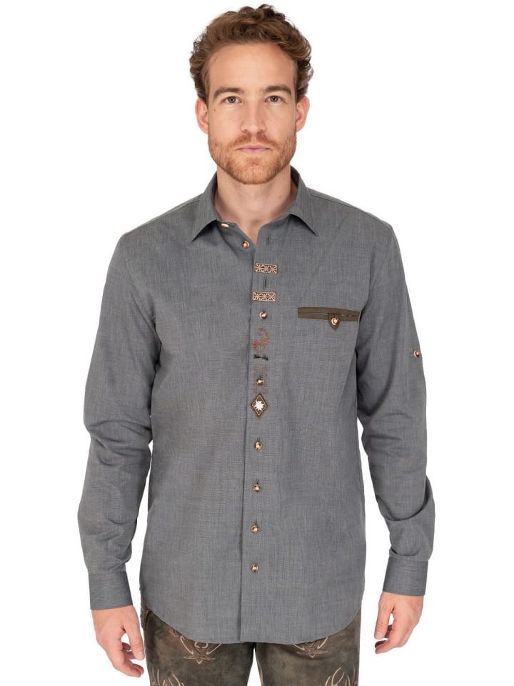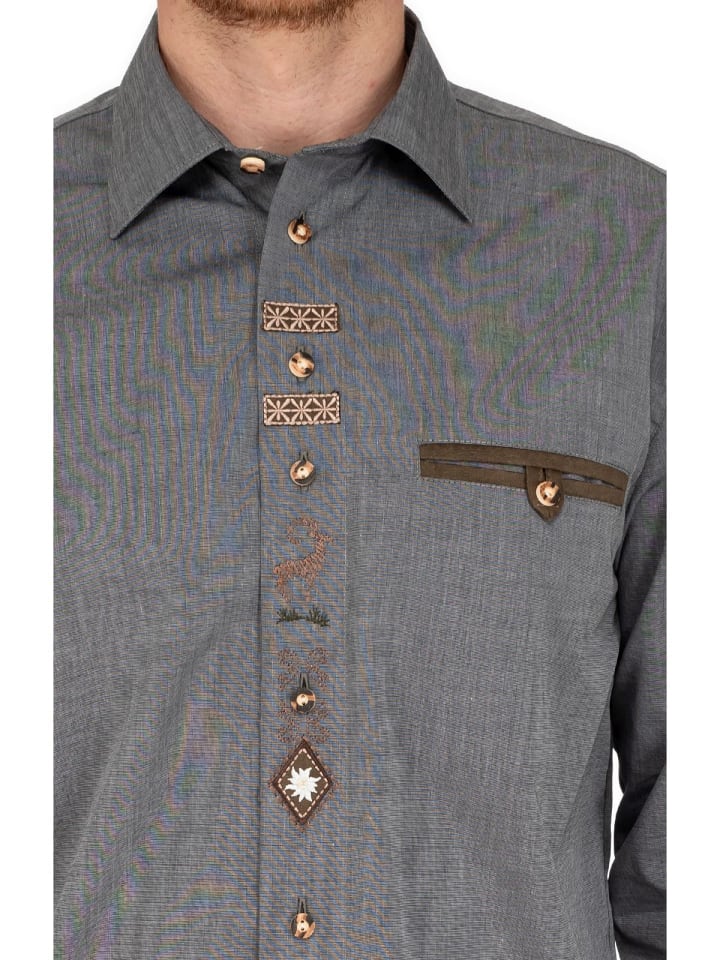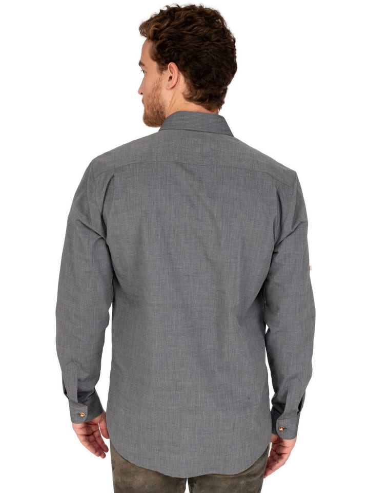 Рубашка с длинными рукавами OS-Trachten 420000-2401-15 антрацитового цвета сочетает в себе классический стиль и современные детали. Прямой крой обеспечивает комфортную посадку и идеально подходит для различных случаев.