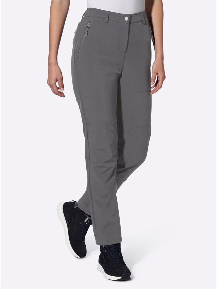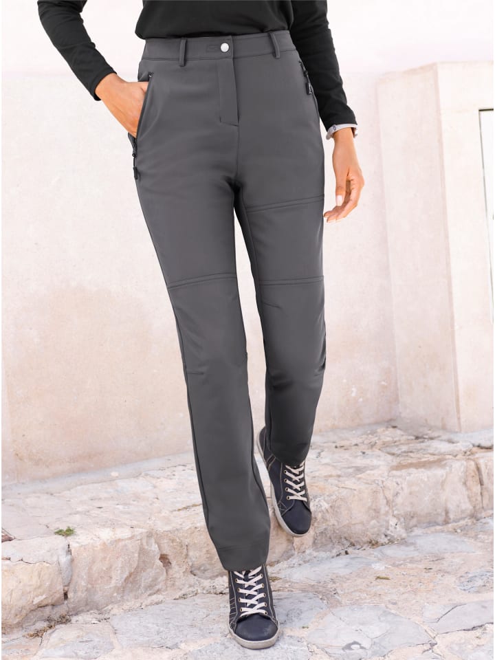 Мягкая внутренняя отделка с начесом делает их невероятно удобными и удивительно теплыми: брюки из софтшелла с эластичным поясом сзади, шлевками для ремня, застежкой на кнопках и молнией. Спереди расположены косые карманы на молнии, а сзади - один карман. Длина брючины примерно 38 см. Ремень в комплект не входит.