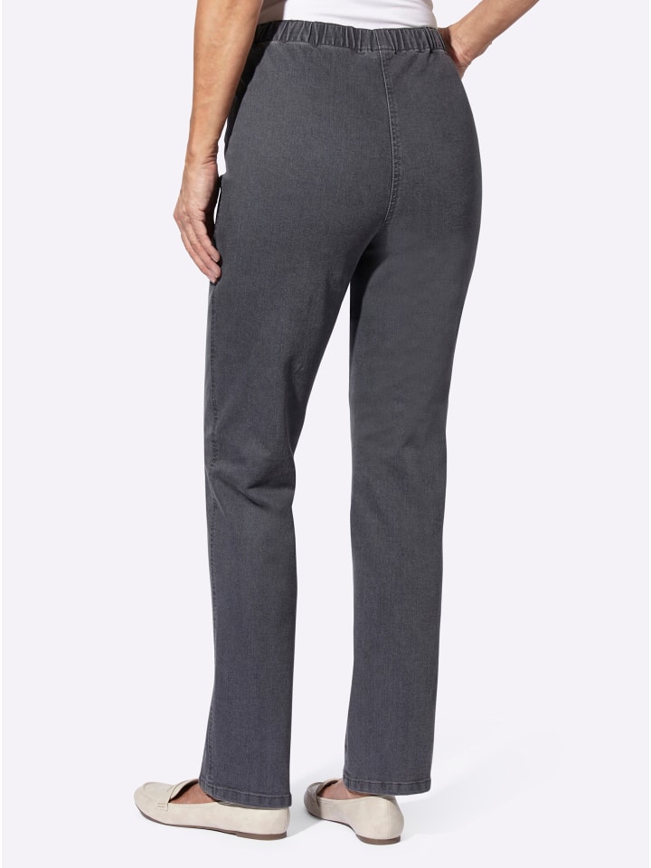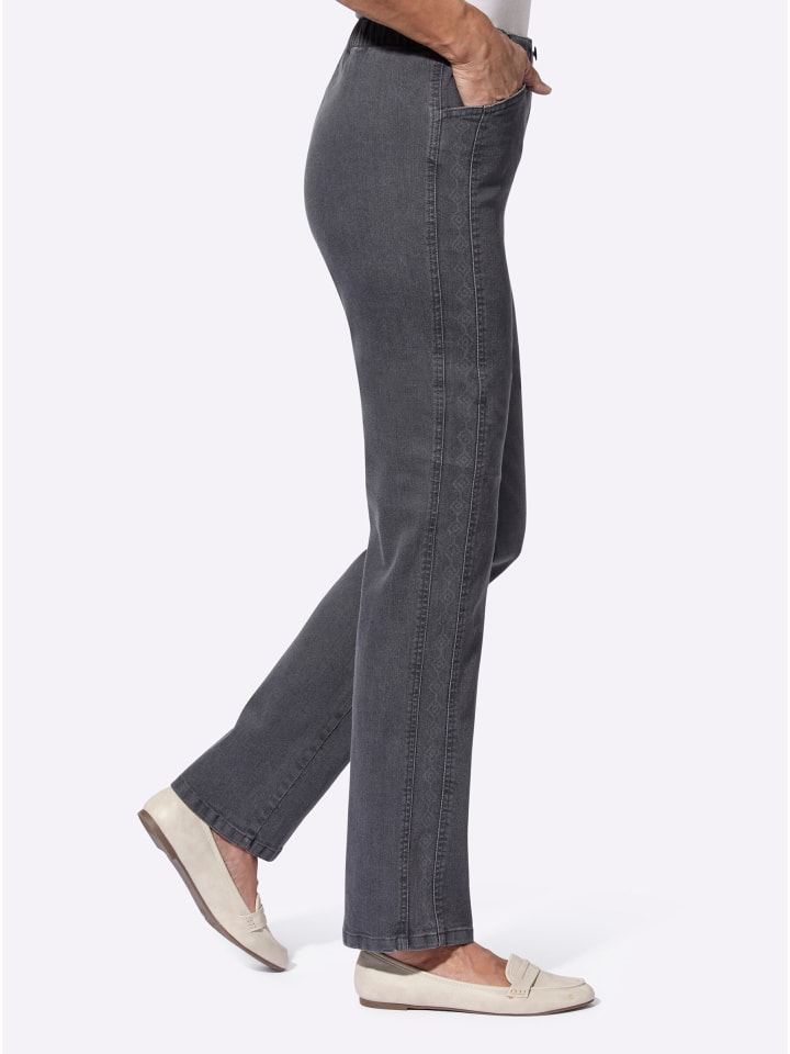 Исключительно удобные джинсы из легкого в уходе эластичного хлопка - просто наденьте их. С пуговицей на поясе по всей длине и застежкой на молнию. Отличительная особенность: смещенный вперед второй шов и напечатанный рисунок по бокам визуально удлиняют фигуру. Два передних кармана. Длина брючины около 40 см. Соответствует инициативе «Сделано в Африке» благодаря использованию переработанного полиэстера.