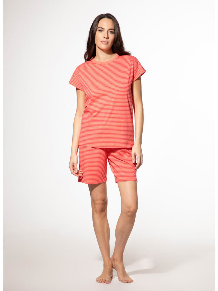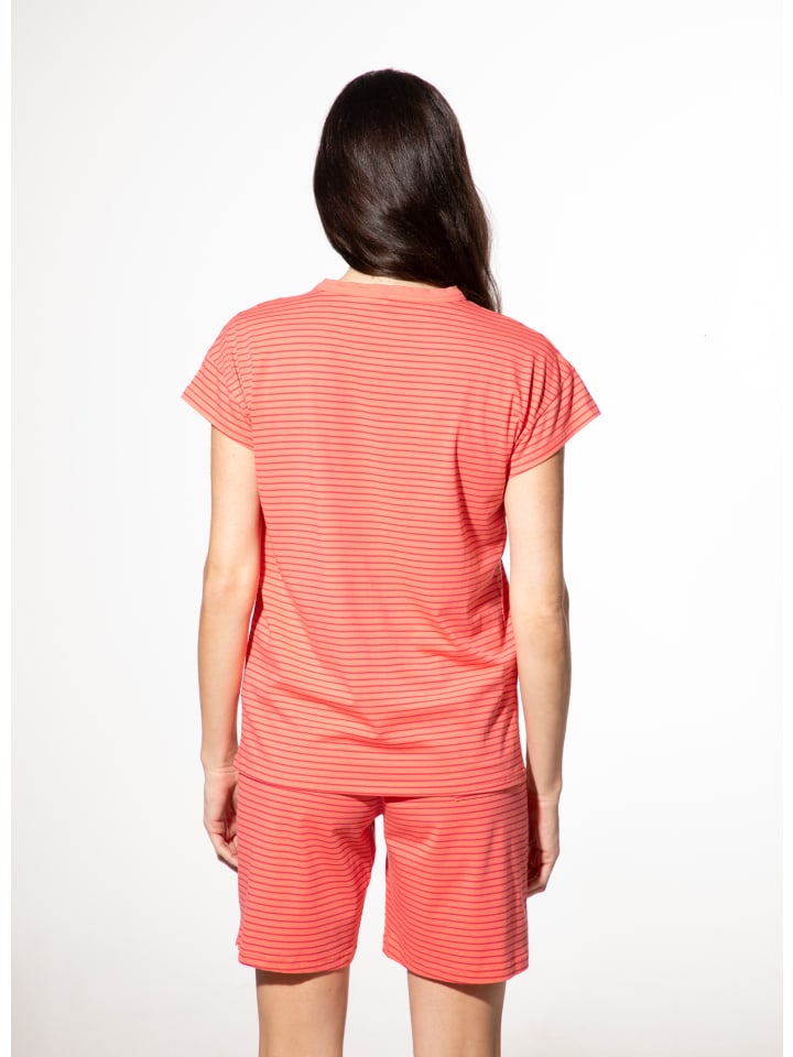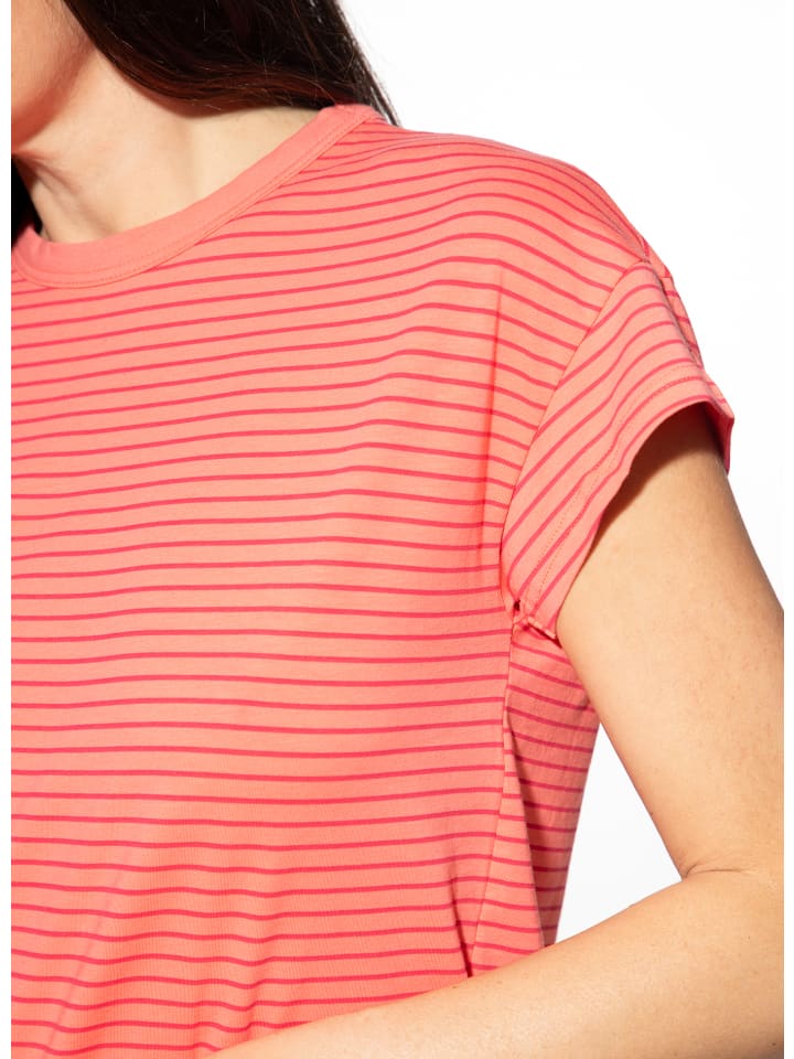 Эта уютная футболка для сна от SHORT STORIES впечатляет своим свежим дизайном в модном дынном цвете. Классический полосатый рисунок в слегка темном дынном оттенке придает футболке современный вид. Благодаря мягкому составу из смеси 95% хлопка и 5% эластана, она приятно тянется, обеспечивая оптимальную свободу движений. Спущенная линия плеч и круглый вырез горловины с однотонной отделкой обеспечивают максимальный комфорт. Идеально сочетается с подходящими шортами для сна или длинными штанами для сна, создавая гармоничный комплект одежды для сна.