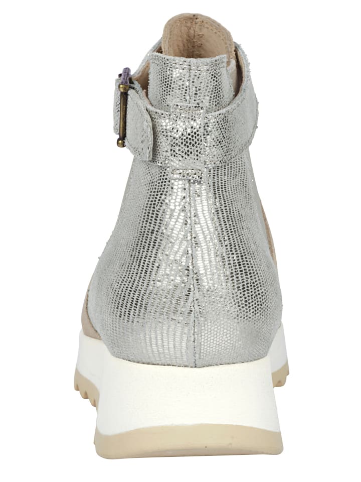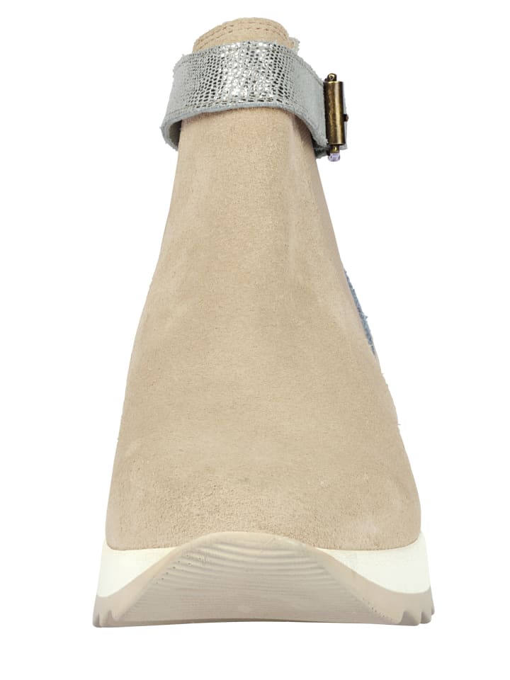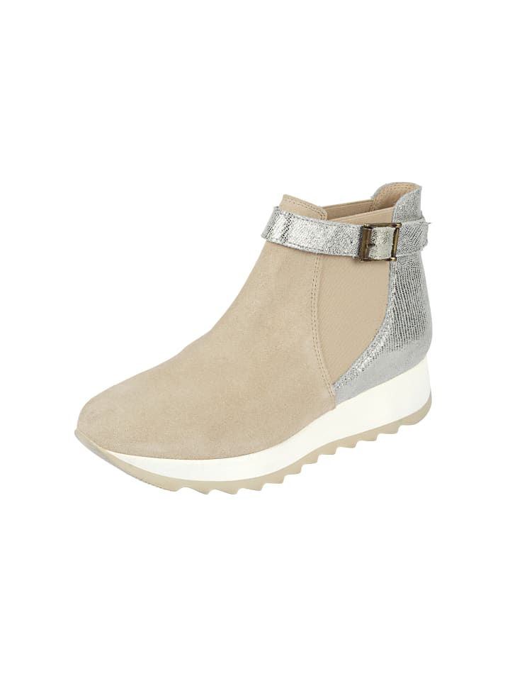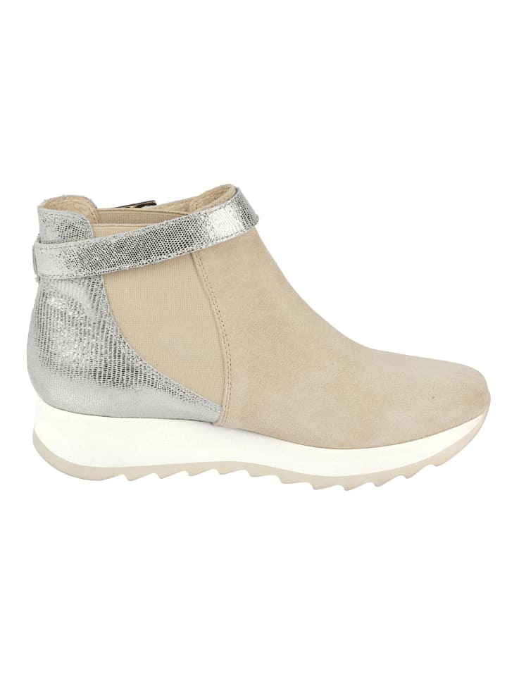Ботинки до щиколотки, произведенные в Португалии. Изготовлены из мягкой коровьей замши, некоторые модели со змеиным принтом и металлической отделкой. С эластичными вставками. Мягкая подкладка. Подкладка и стелька: кожа. Каблук-танкетка высотой около 35 мм.