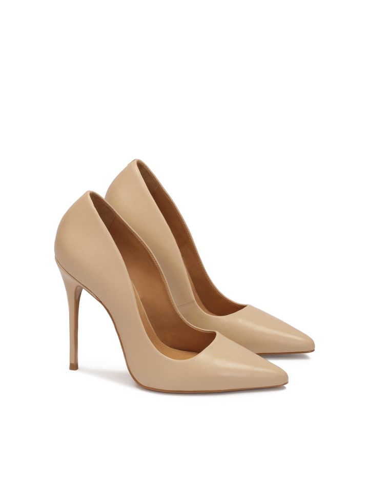 Бежевые туфли-шпильки классического простого кроя - неотъемлемая часть вневременного женского гардероба. Благодаря своей универсальности и нейтральному цвету они сочетаются практически с любым стилем. Представленная модель изготовлена из высококачественной, прочной натуральной кожи, что добавляет ей привлекательности. Туфли с острым носком и тонким каблуком подойдут как для особых случаев, так и для повседневной жизни.