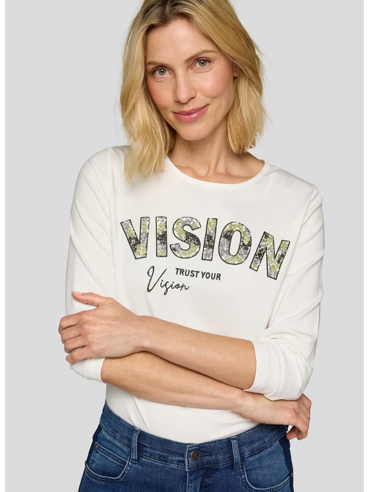 Эта рубашка с ярким принтом «VISION - trust your vision» и мерцающими эффектами станет модным акцентом в повседневных образах. Мягкий трикотаж. Блестящая надпись-аппликация. Круглый вырез горловины с изящной отделкой. Облегающий крой. Идеально подходит для отдыха и повседневной носки.