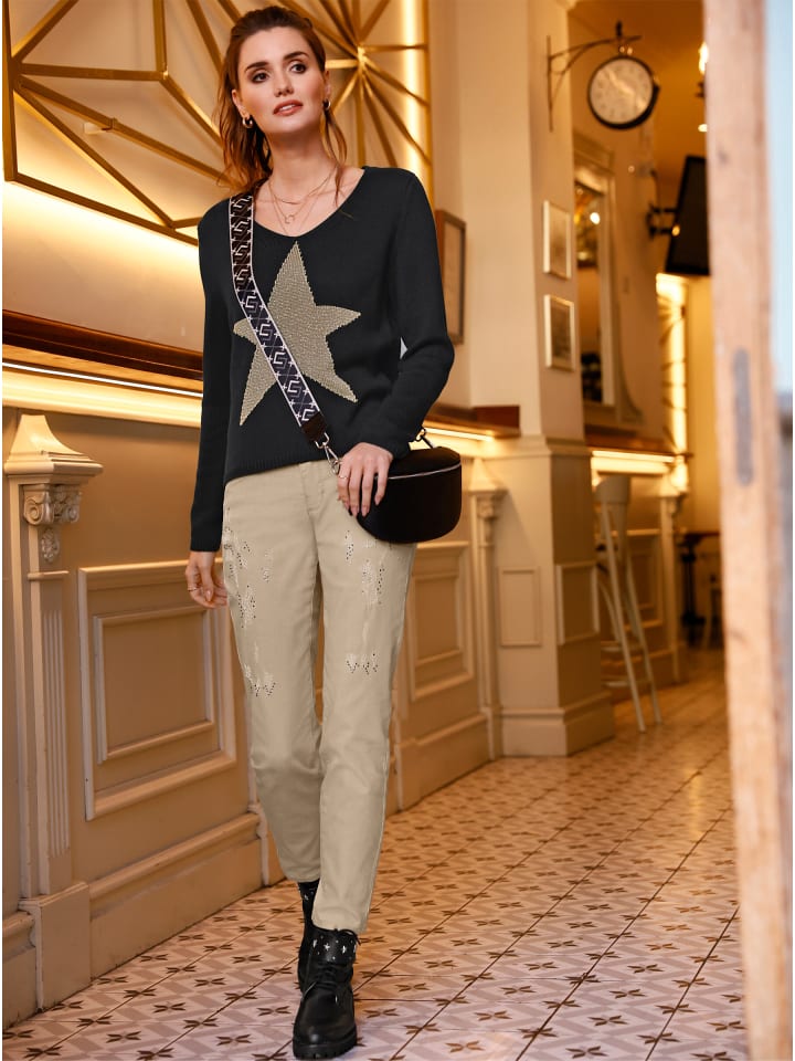 Эти джинсы длиной до щиколотки с эффектом пуш-ап подчеркнут вашу фигуру благодаря изысканному крою с вытачками и кокеткой сзади. Они также впечатляют небрежно потертыми деталями и отделкой стразами спереди. Особенности: фигурный пояс со шлевками для ремня, застежка на пуговицу и молнию спереди, два передних кармана и карман для монет, а также два задних кармана с декоративной строчкой. Соответствуют инициативе «Сделано в Африке» (Cat. Made in Africa). Длина брючины около 32 см. Ремень в комплект не входит.