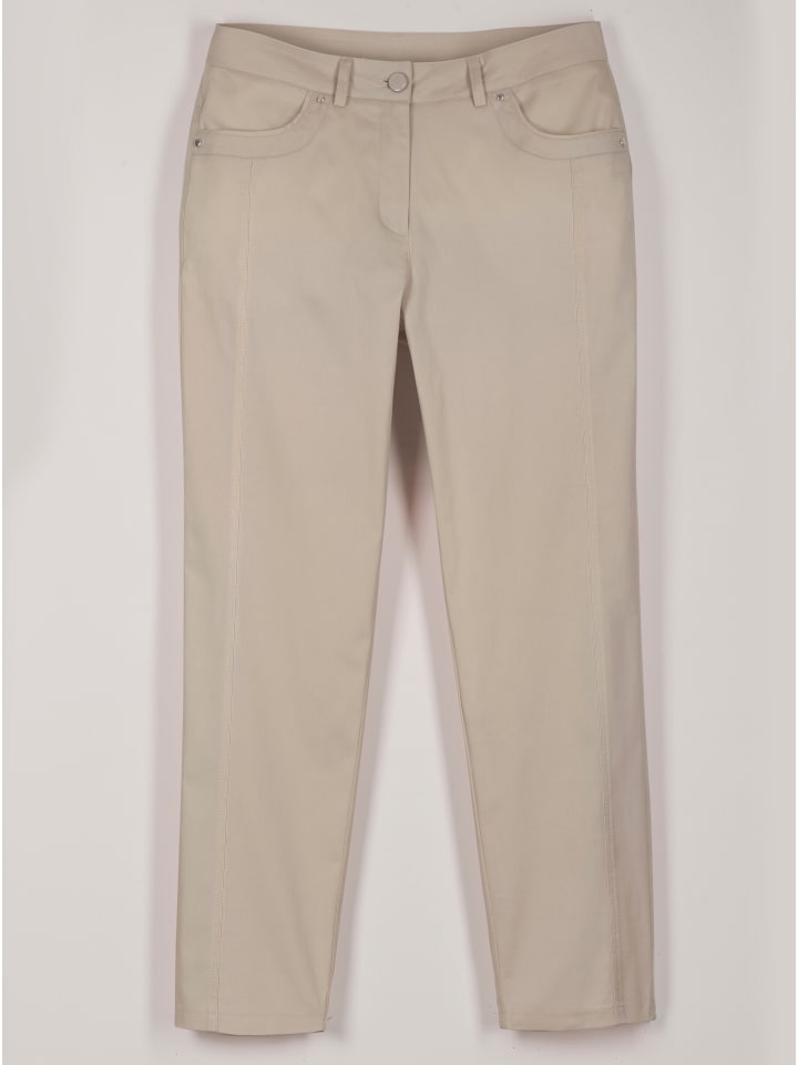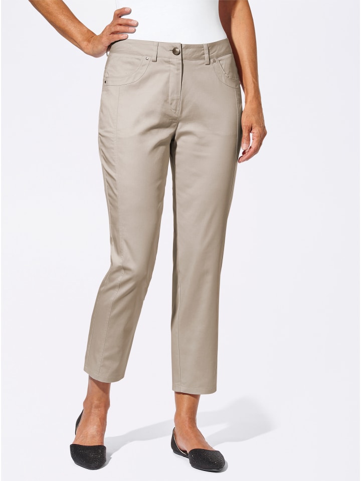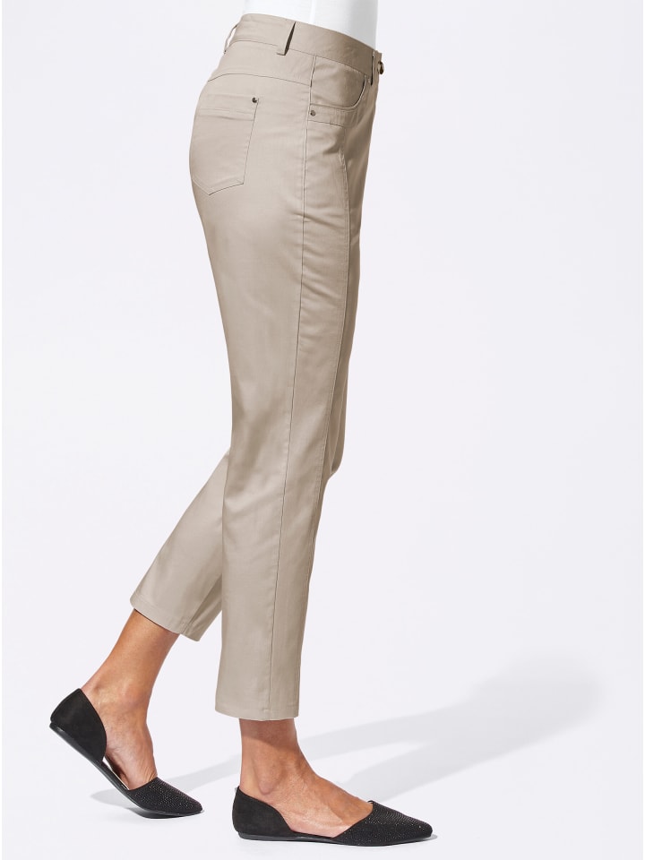Эти воздушные брюки длиной 7/8 - популярный вариант для повседневного лета. Они имеют фигурный пояс, шлевки для ремня и застежку на пуговицу и молнию. Кокетка сзади обеспечивает отличную посадку. Серебристые заклепки украшают округлые прорезные карманы спереди и накладные карманы сзади. Декоративные боковые швы создают эффект удлинения. Длина брючины примерно 36 см.