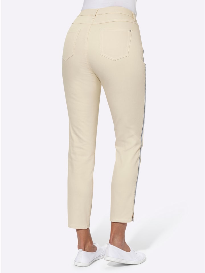Джинсы 7/8 с легким эффектом потертости и популярным фасоном «5 карманов». Идеальная посадка благодаря поясу с петлями для ремня, застежке на пуговицу и молнию, кокетке сзади и эластичной ткани. Трехцветные полосы по бокам вдоль штанин создают эффект удлинения. Разрезы по штанинам. Длина штанины примерно 32 см. Ремень в комплект не входит.