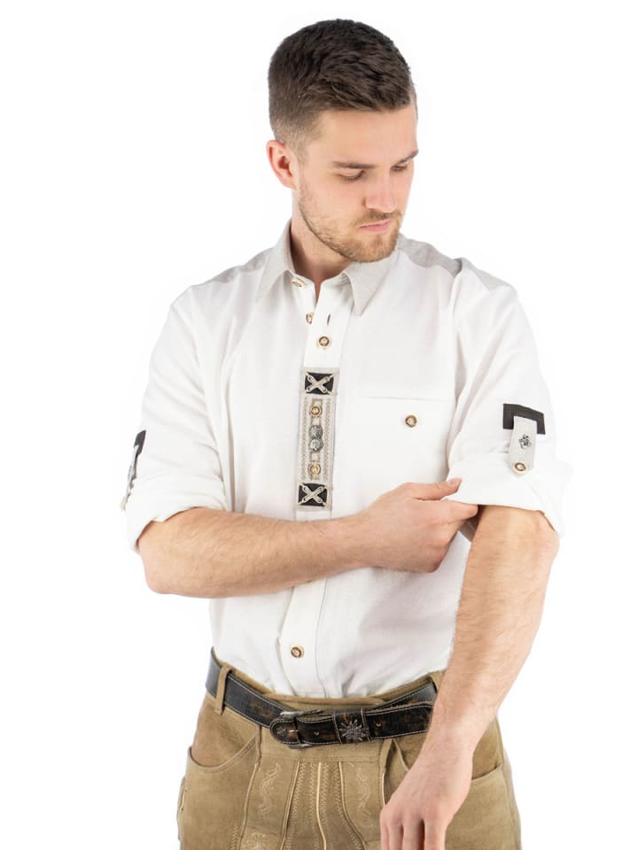 Традиционная рубашка, которая притягивает взгляд. Тканевые аппликации и вышивка украшают верхнюю планку с пуговицами, а пуговицы в форме оленьего рога продолжают традиционный стиль от воротника до подола. Контрастная область плеч, застегивающийся нагрудный карман и небольшие хлястики для фиксации закатанных рукавов также являются яркими деталями. При таком обилии украшений основной цвет должен оставаться нейтральным: доступны белый и черный. Рубашки изготовлены из чистого хлопка в Европе.