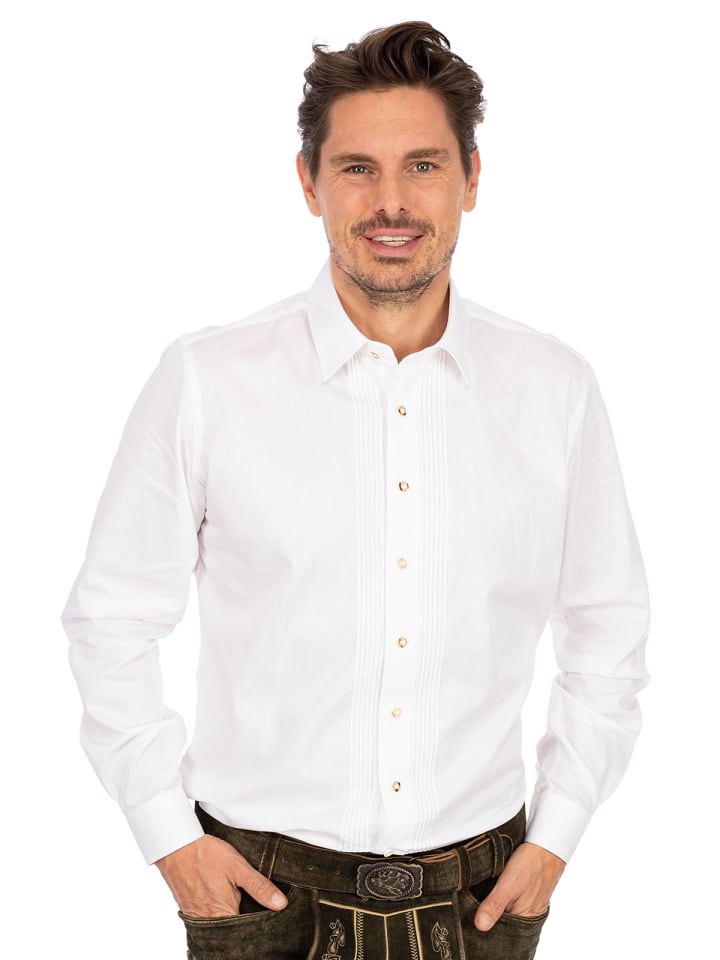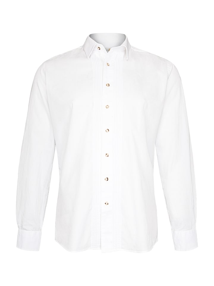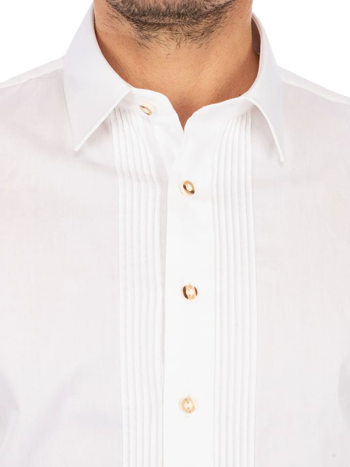 Белая рубашка классического кроя. Эта рубашка из нашего интернет-магазина - отличный выбор для мужчин, ценящих классический и элегантный образ. Стильная рубашка с классическим воротником-стойкой изготовлена из 100% хлопка, приятна на ощупь и имеет удобную посадку. Длинная планка с пуговицами имеет легкие складки по краям, что придает рубашке интересный вид.