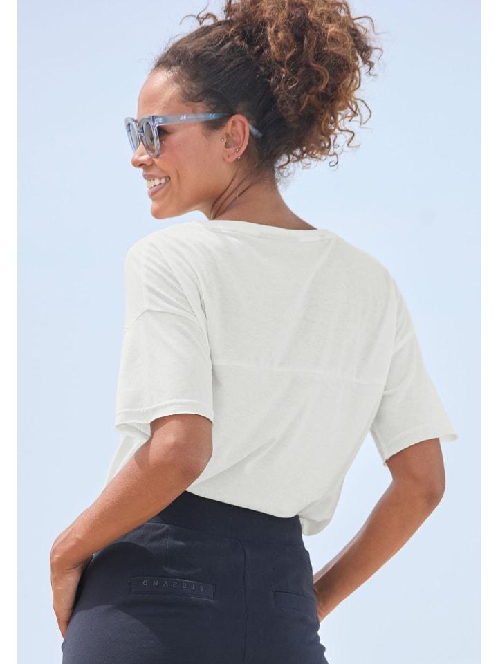 Свободная, но стильная футболка от Elbsand с ярким логотипом бренда спереди. Горизонтальный декоративный шов сзади добавляет приятную деталь. Свободный крой. Классический круглый вырез горловины. Идеально подходит для отдыха. Мягкая хлопковая ткань.