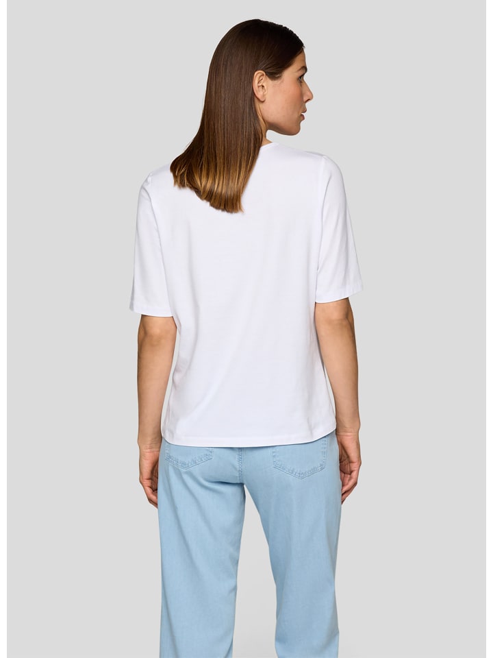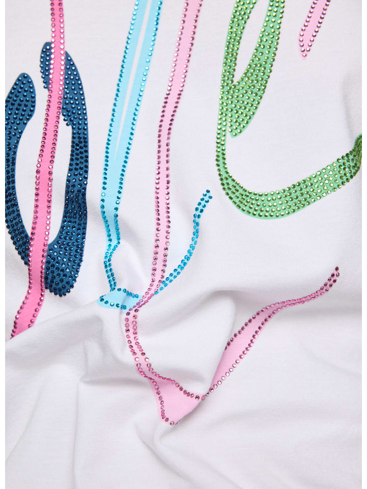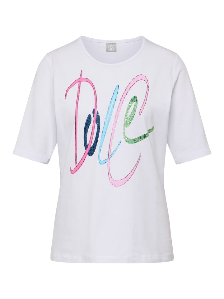 Эта белая футболка действительно привлекает внимание своей крупной разноцветной надписью «Dolce». Надпись украшена сверкающими стразами, что придает образу свежий и модный штрих. Прямой крой и эластичная ткань обеспечивают комфорт и отличную посадку. Круглый вырез горловины с узкой планкой. Цветная отделка стразами спереди. Рукава до середины голени удобной длины. Эластичная хлопковая ткань обеспечивает непревзойденный комфорт. Идеально подходит для летних повседневных образов.