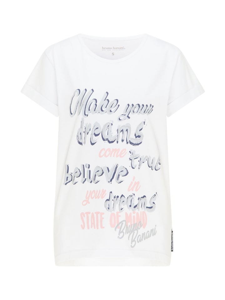 Эта футболка bruno banani гарантированно исполнит вашу мечту: стать идеальной базовой вещью на лето. Нежный блестящий принт, напоминающий мелкие пайетки, идеально подчеркнет вас и ваш стильный образ. Слегка удлиненная спинка с закругленным подолом и визуально закатанные рукава добавят этому топу еще больше привлекательности. Она идеально дополнит ваш образ с джинсами, укороченными брюками или летними брюками.