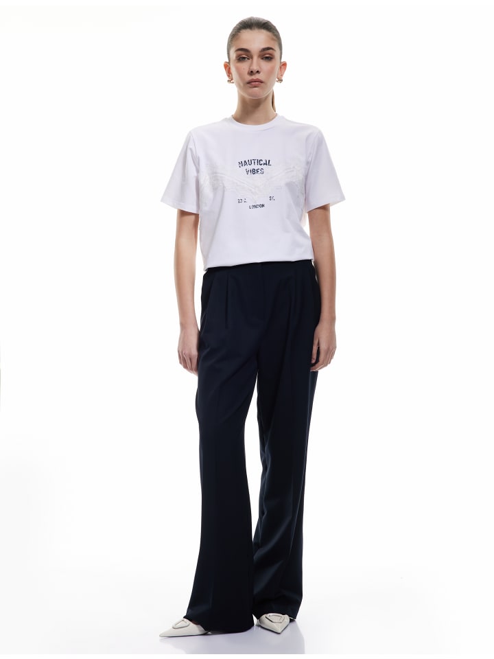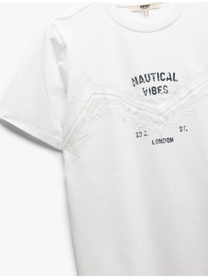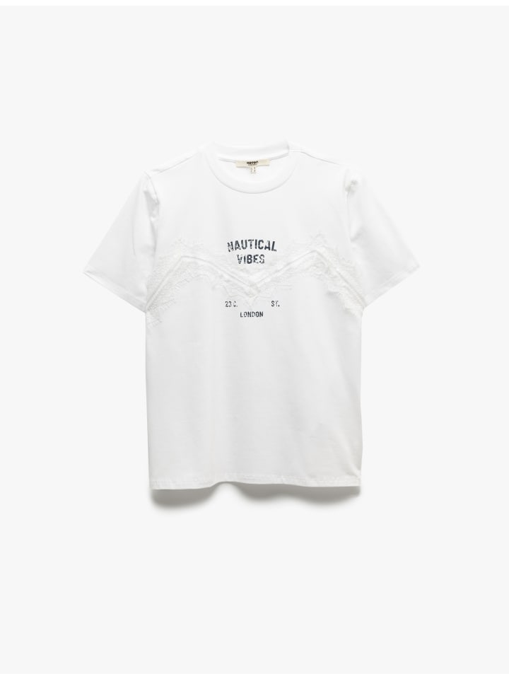 Эта футболка с короткими рукавами украшена стильными кружевными деталями и модным принтом. Круглый вырез горловины создает повседневный спортивный образ, идеально подходящий для различных случаев. Мягкая и дышащая хлопковая ткань обеспечивает комфорт в течение всего дня. Сочетайте ее с джинсами или юбками для создания непринужденного изысканного образа.