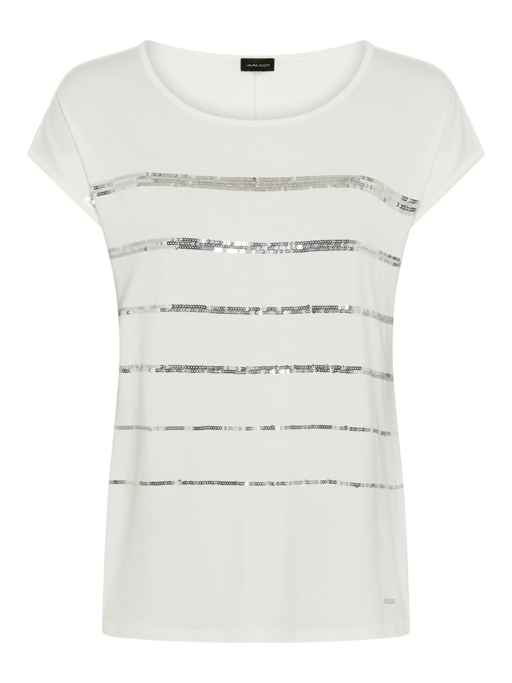 Универсальная женская футболка от Laura Scott. Длина до бедер, выгодно подчеркивающая фигуру, украшена стильными мерцающими пайетками. Эластичный трикотаж обеспечивает мягкое облегание.